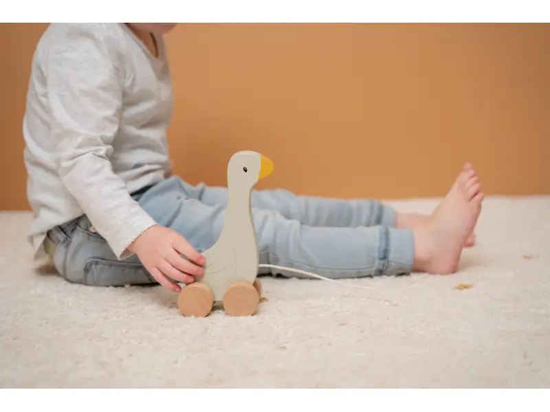 Hus na kolieskach v krásnom drevenom prevedení má šnúrku, aby ju dieťa mohlo ťahať za sebou.