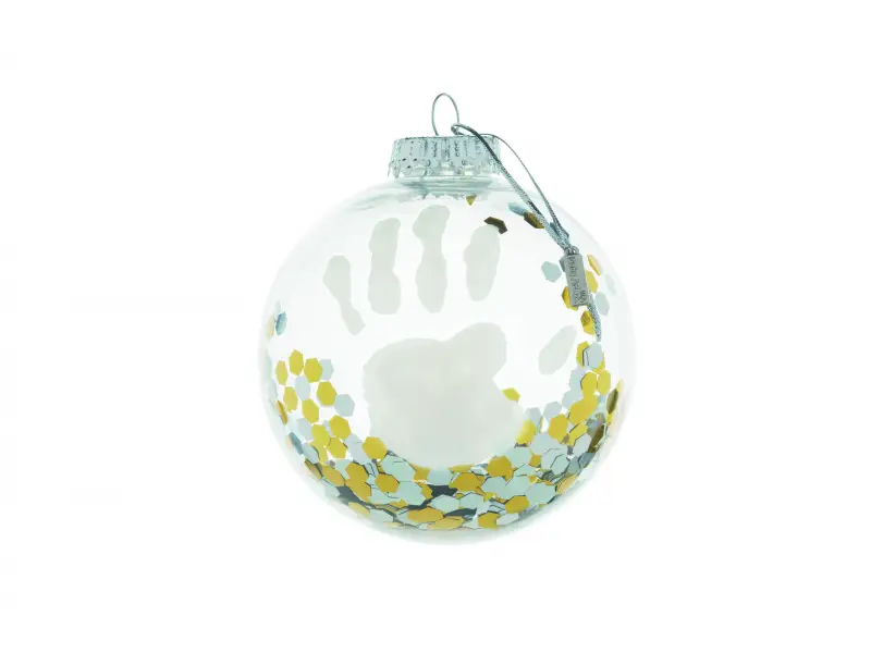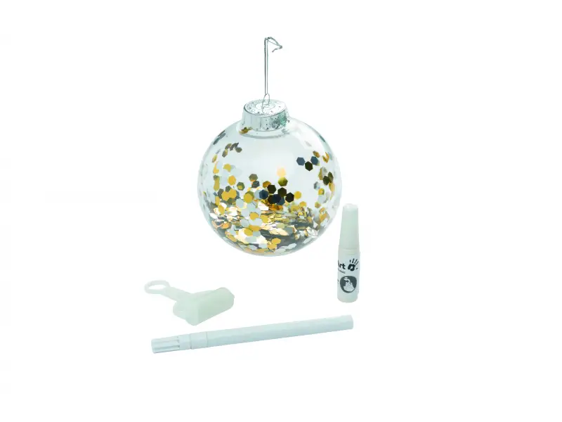 Sada obsahuje priehľadnú farebnú guľu z vysoko kvalitného plastu, naplnenú glitrami, potreby pre výrobu odtlačku a popisovač pre napísanie napr. mena dieťaťa.