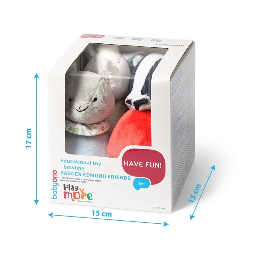 Veselé plyšové kolky s jazvecom Edmundom a jeho kamarátmi učia dieťa priestorovému mysleniu a rozvíjajú jemnú aj hrubú motoriku. Každá figúrka zo setu môže byť samostatná hračka – hrkálka jazvec, zvonček lopta, pískacia ovečka, šuštiaca myška. Set je z obľúbenej kolekcie Play More Collection a zavedie vaše dieťatko do rozmanitého sveta farieb, zvukov a tvarov. Myšlienkou tejto kolekcie na hranie je podnietiť detskú zvedavosť a povzbudiť ich, aby sa učili prostredníctvom hry.