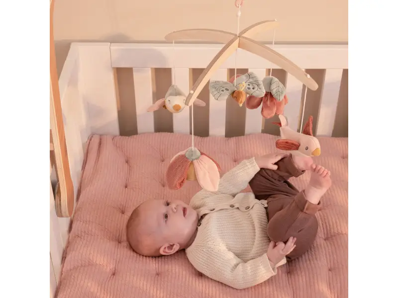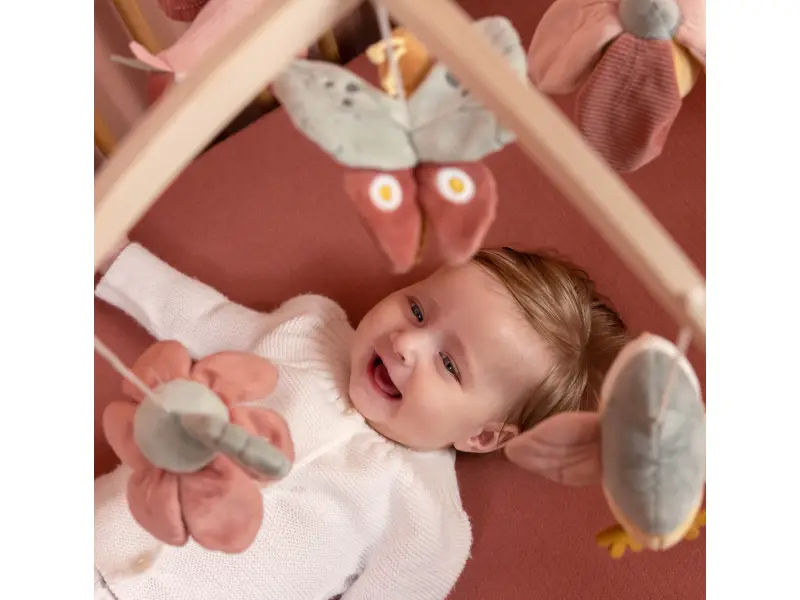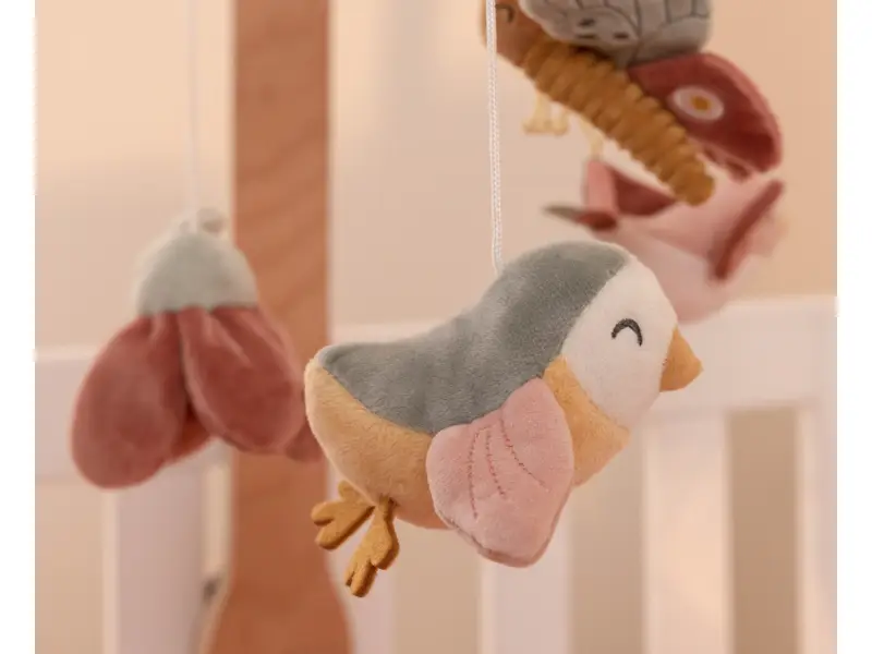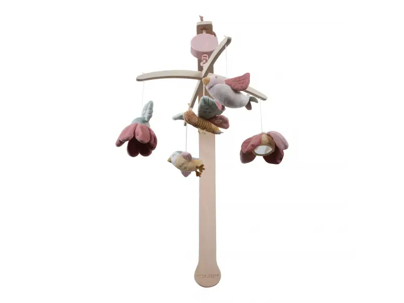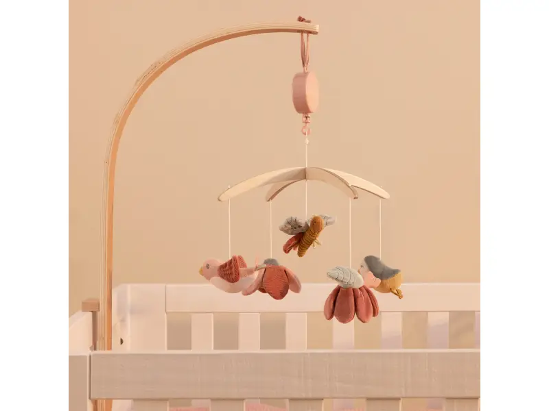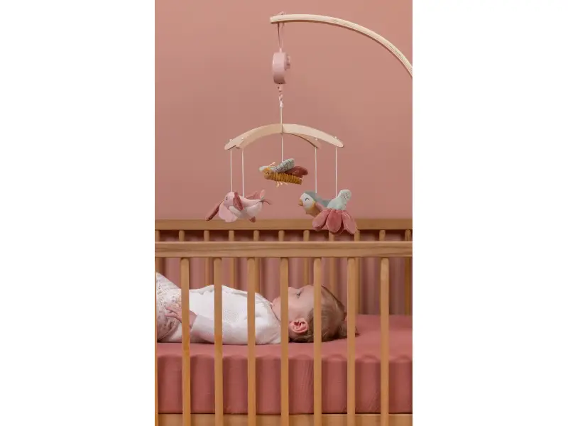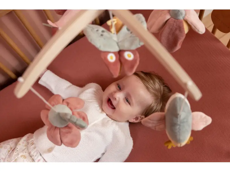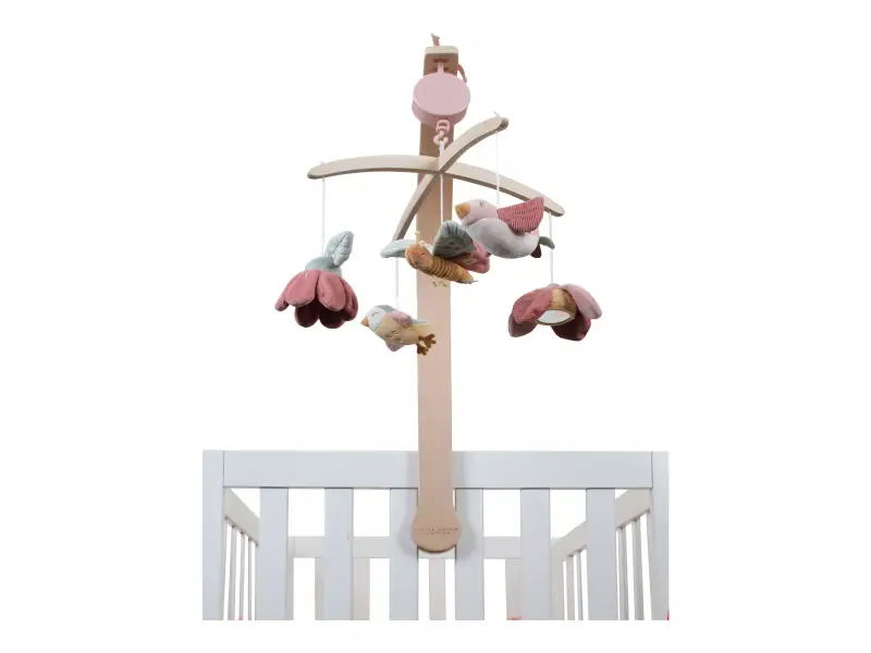 Krásny drevený kolotoč z kolekcie hračiek Little Dutch Kvety a motýle hrá po natiahnutí uspávanku na upokojenie vášho bábätka pred spaním. Pozornosť dieťaťa upúta päť otáčajúcich hračiek v podobe vtáčikov, kvetov a motýľa.