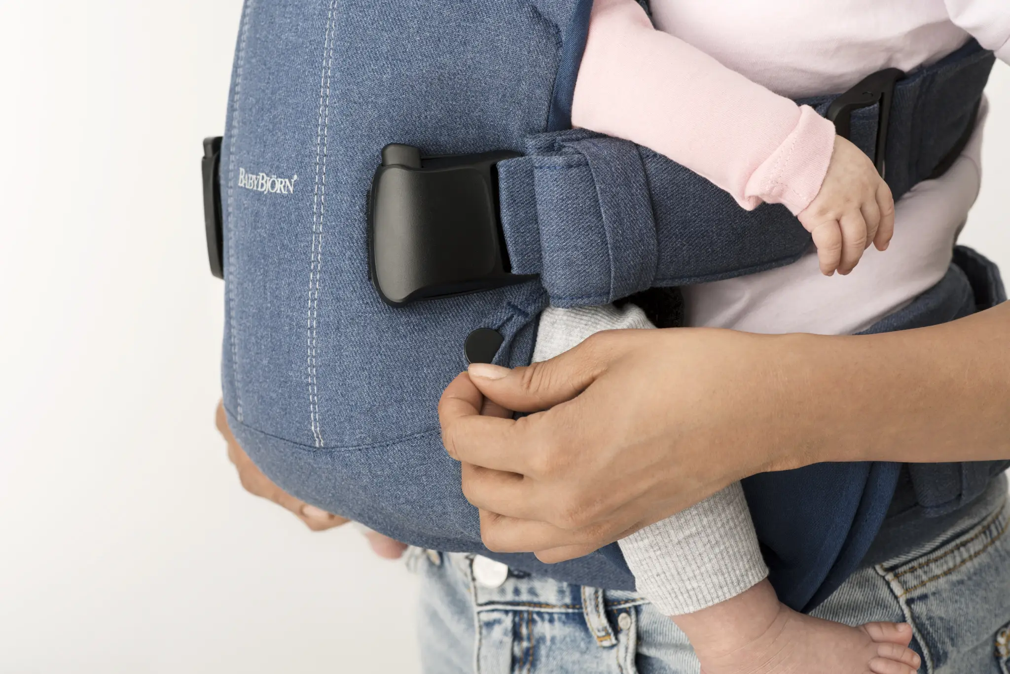 Nosítko môžete ľahko nastaviť tak, aby dokonale sadlo vám i vášmu partnerovi, takže sa môžete bez obáv striedať v nosení dieťatka. Bezpečnostné kliknutie vás upozorní na to, že ste všetky pracky zapli správne.
