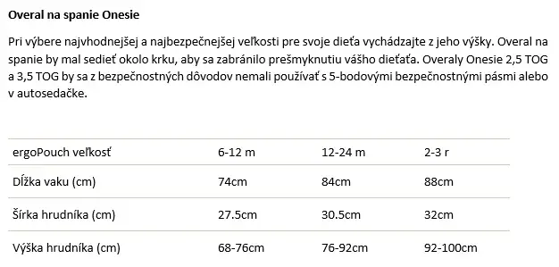 Overal Onesie je alternatívou spacieho vaku s označením TOG, ktorá je určená na nosenie samostatne počas spánku. Sú ideálnou voľbou pre batoľatá, ktoré prechádzajú do veľkej postele, spáčov, deti, ktoré odkopávajú prikrývky alebo malé hviezdičky, ktorým sa nepáči obmedzenie spacieho vaku. Spací vak je vyrobený z organickej bavlny s certifikátom GOTS, ktorá je netoxická a šetrná k podráždenej pokožke a je ňou aj vyplnený. Strečový materiál umožňuje vášmu dieťatku voľný pohyb a pohodlie pri spánku. Trojcestný potvrdzovací zips je užitočný pri nočných výmenách plienok alebo cestách na toaletu a manžety na nohy dodávajú extra teplo malým prstom.