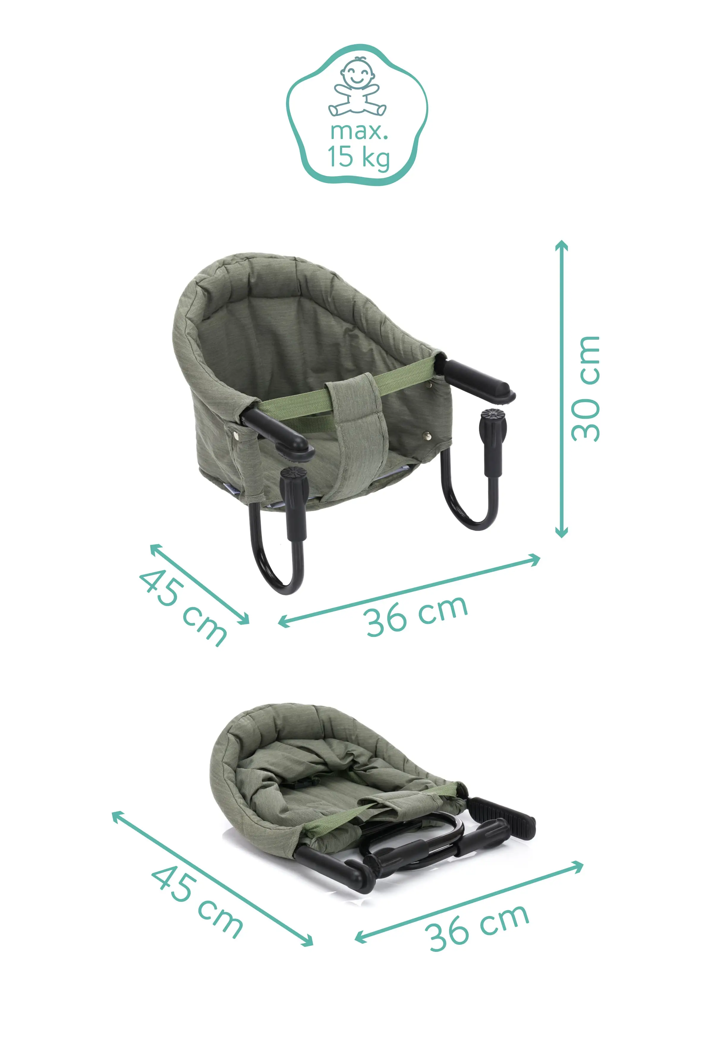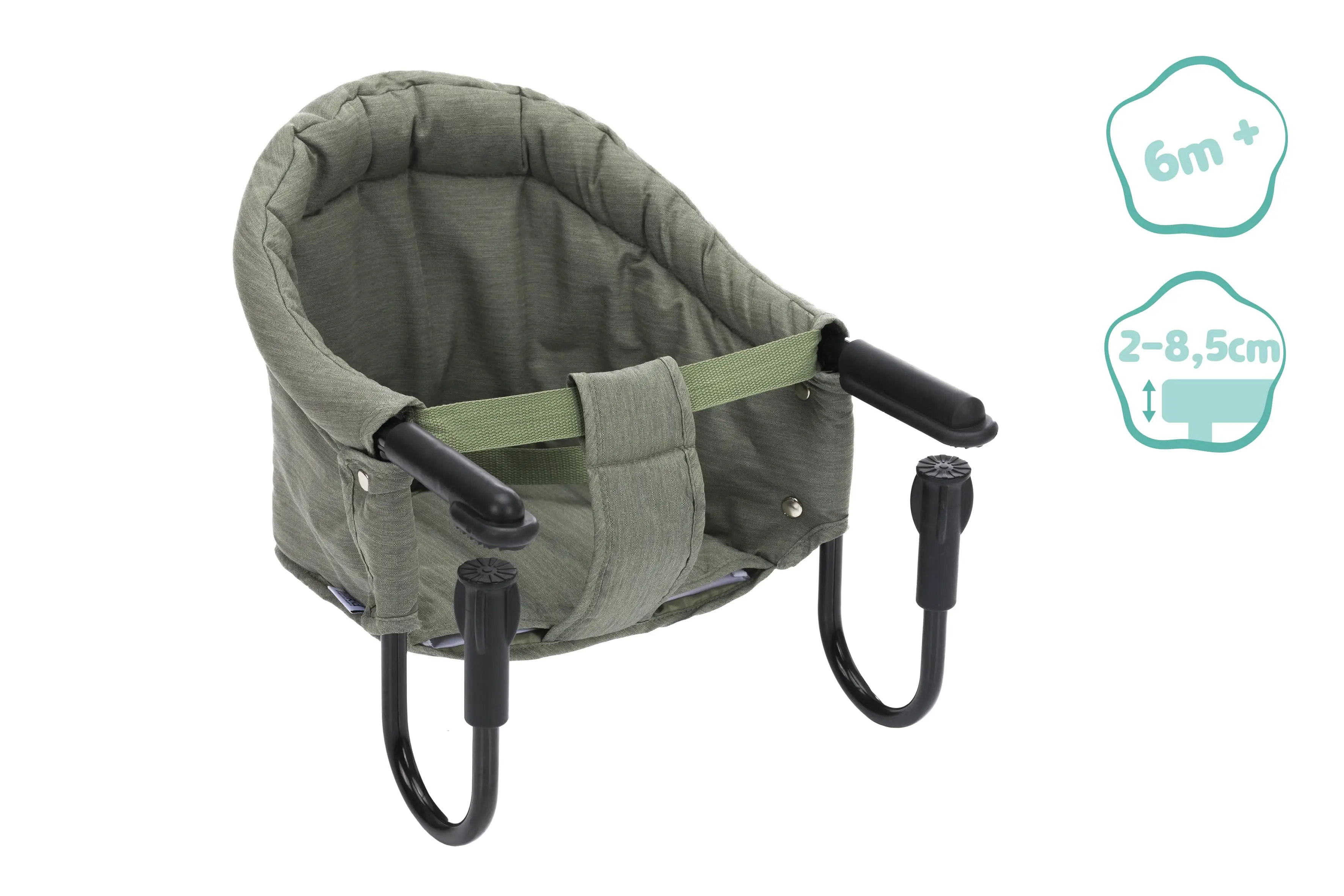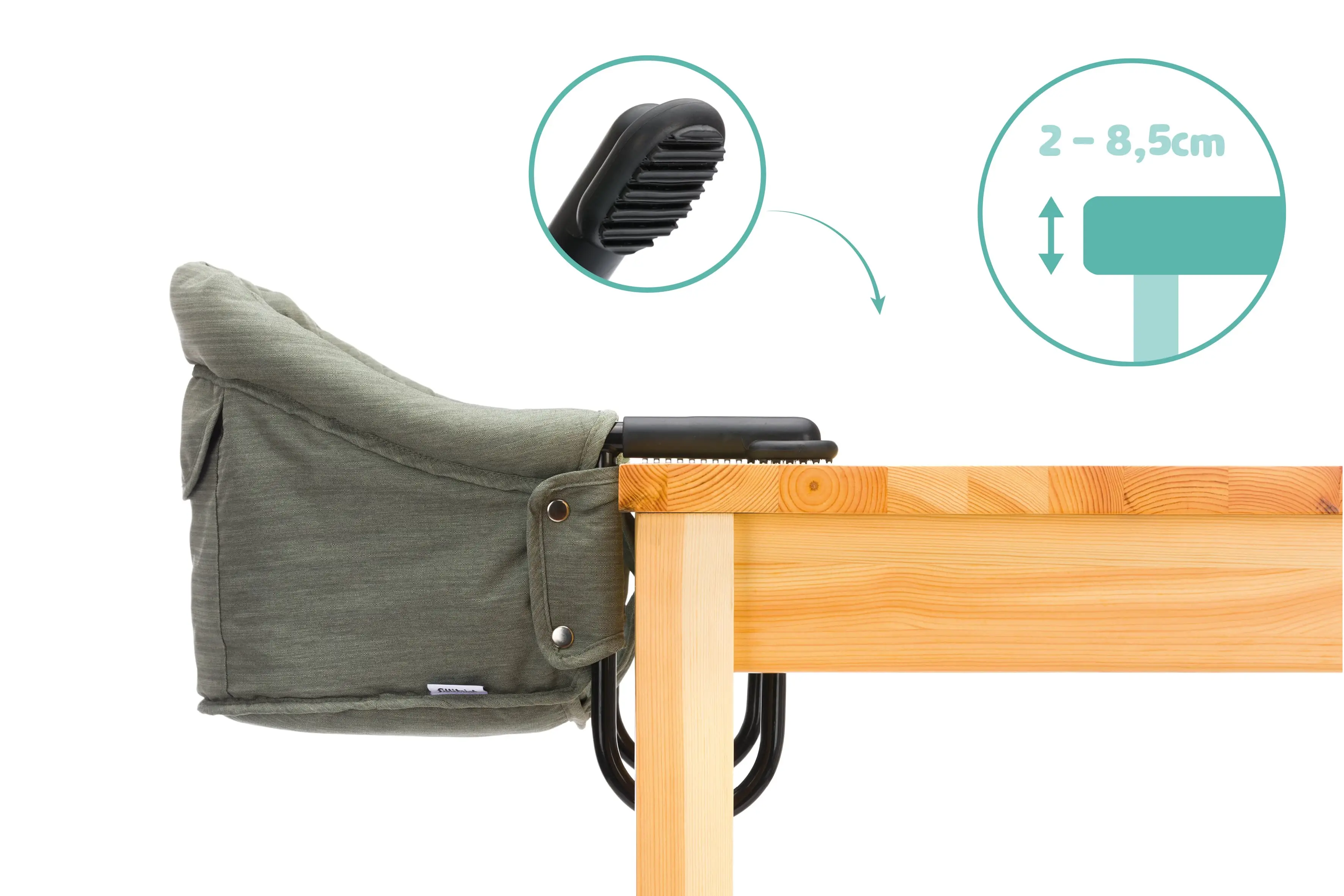 Na stôl sa ľahko pripevní pomocou systému skrutiek, ktorý sa hodí takmer na každú dosku stola (max. šírka 8,5 cm). A ak sa nejaké jedlo zašpiní, nie je to žiadny problém. Poťah sa dá ľahko odňať a vyčistiť ručne.