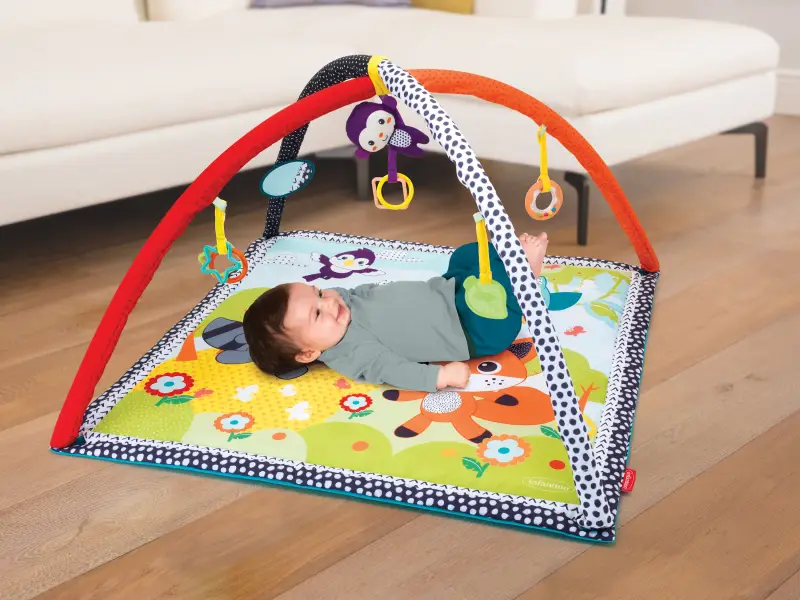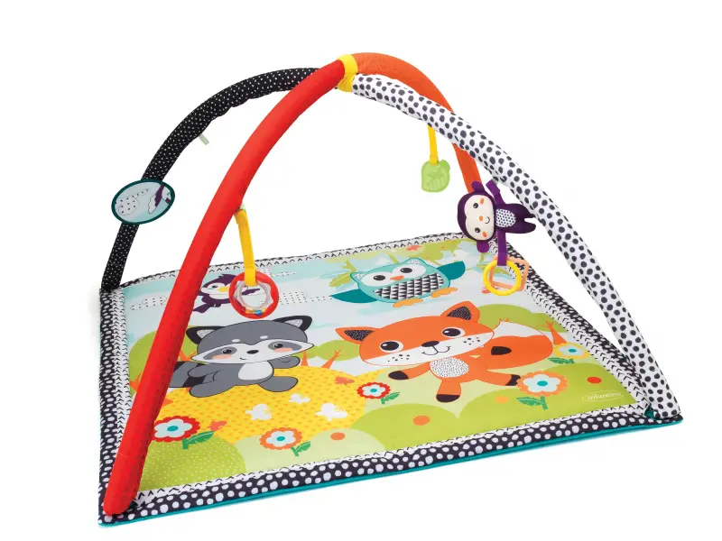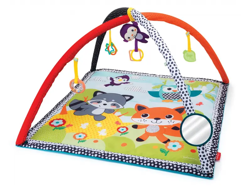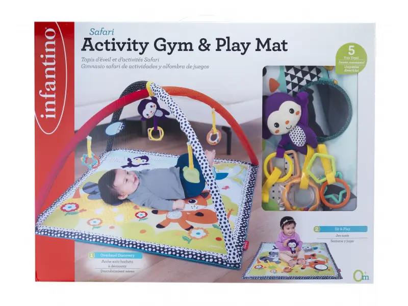 Hracia deka s krásnymi ilustráciami zvieratiek a odnímateľnou opičkou. Zavesené odnímateľné hračky na hrazde zabavia a nabádajú k skúmaniu bábätko ležiace na chrbte. Bezpečné zrkadielko pomáha zabaviť dieťa v polohe na brušku, ktorá je dôležitá pre posilňovanie krčných a chrbtových svalov, ktoré neskôr umožňujú dieťaťu začať sa pretáčať, liezť a sedieť bez opory.