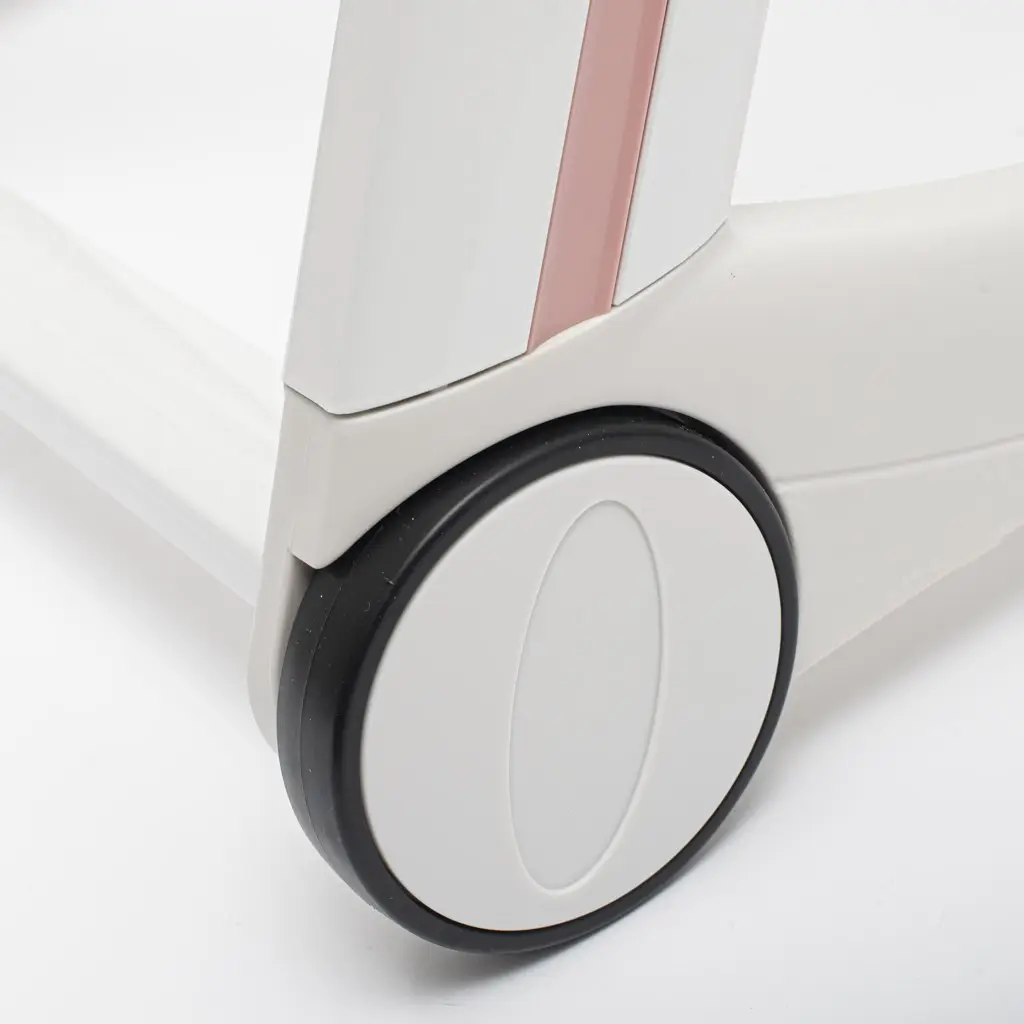 -Stolička je vybavená dvoma brzdovými kolieskami a dvoma gumovými nožičkami