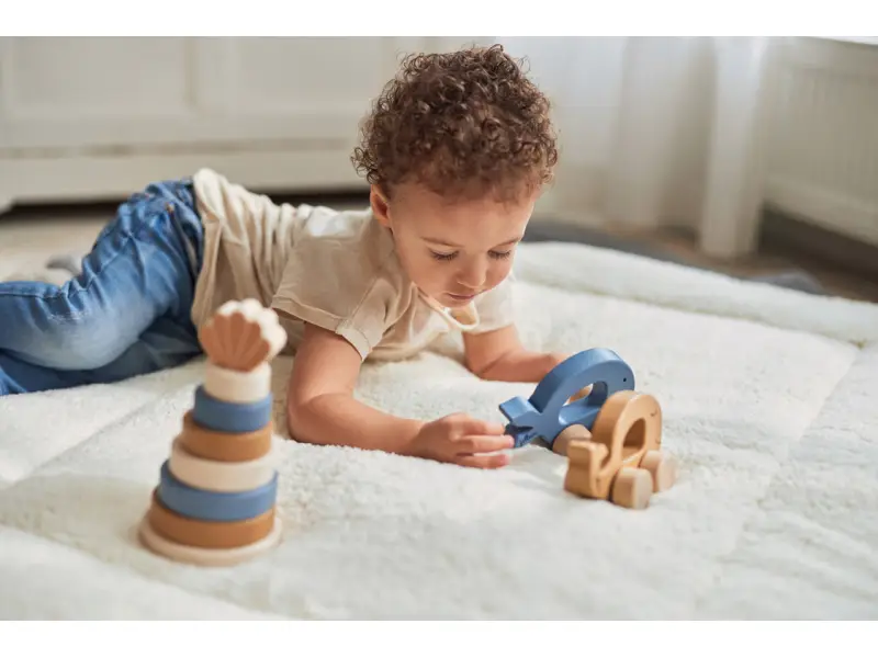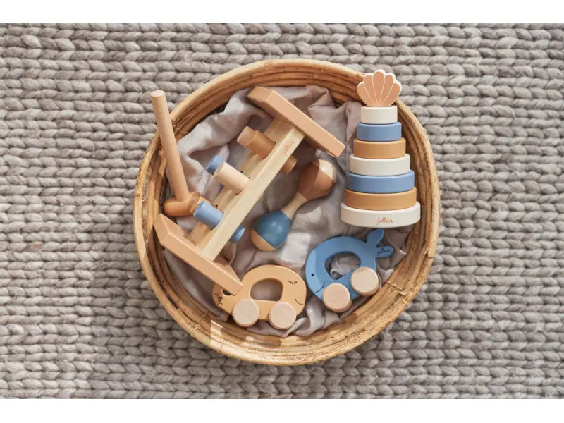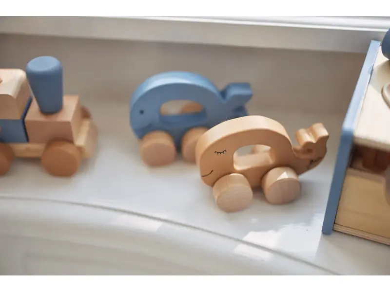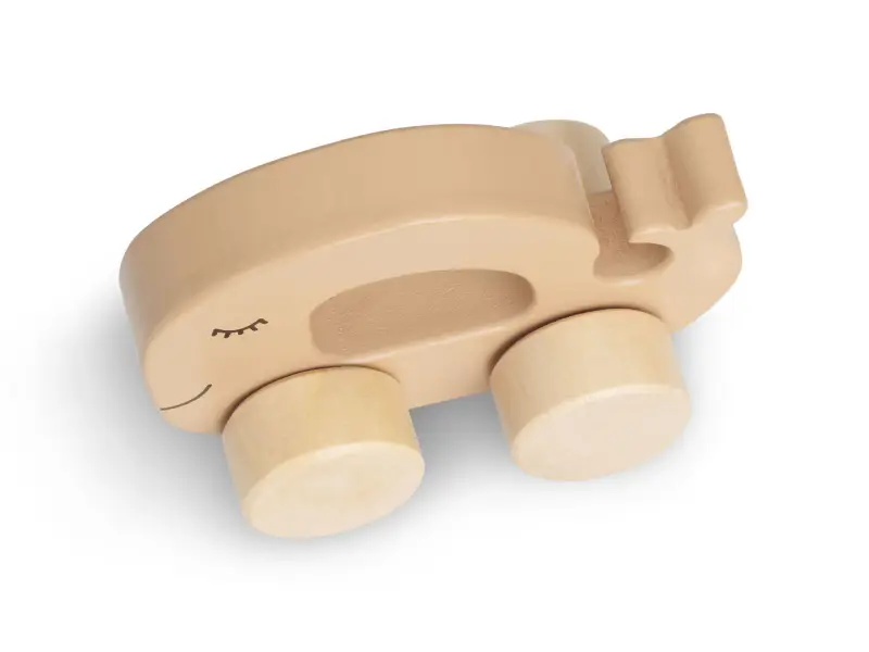 Drevená rybka má tvar pre ľahké držanie a kolesá pre hladkú jazdu.