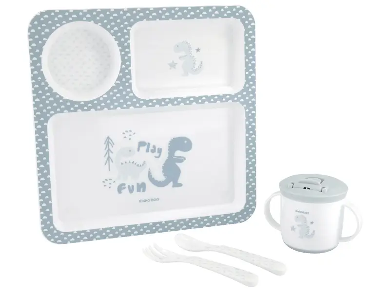 Jedálenskú sadu s krásnou potlačou tvorí delený tanier, hrnček s náustkom, vidlička a lyžička. Delený tanier ponúka aj priestor na bezpečné postavenie hrnčeka s pitím.