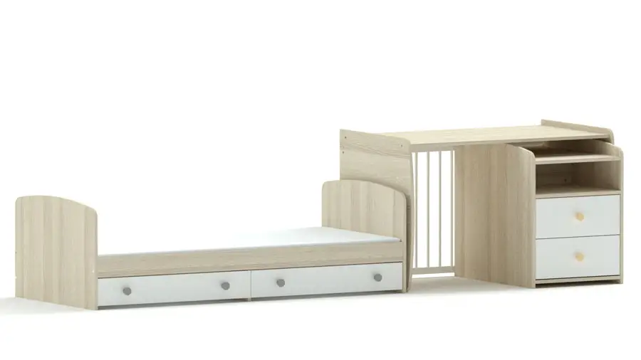 Aj keď sa môže zdať kombi postieľka na prvý pohľad robustná, opak je pravdou. Veď na 2 metroch štvorcových máte všetko, čo inde zaberá omnoho viac priestoru - postieľku aj prebaľovaciu komodu. Toto riešenie odporúčame pre menšie detské izbičky. Univerzálnosť zostavy spočíva v jej rozložiteľnosti na jednotlivé kusy nábytku.