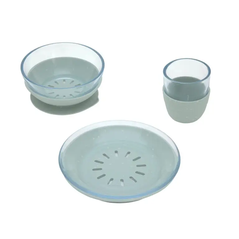 Sklenený jedálenský set s odnímateľnými silikónovými základňami je vyrobený z borosilikátového skla, ktoré je stabilnejšie a robustnejšie ako bežné sklo. Silikónové základy zaistia, že riad nebude kĺzať po stole. Je teda skvelým pomocníkom pri stolovaní a prvých pokusoch vašej ratolesti sa vlastnoručne nakŕmiť.
