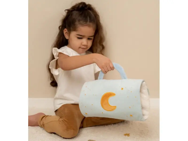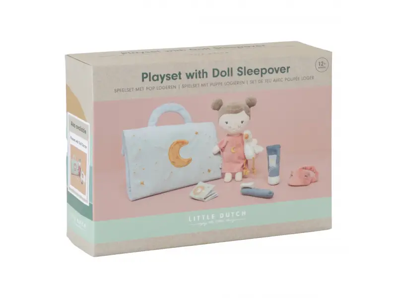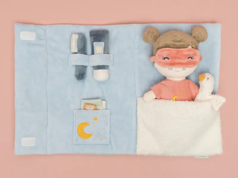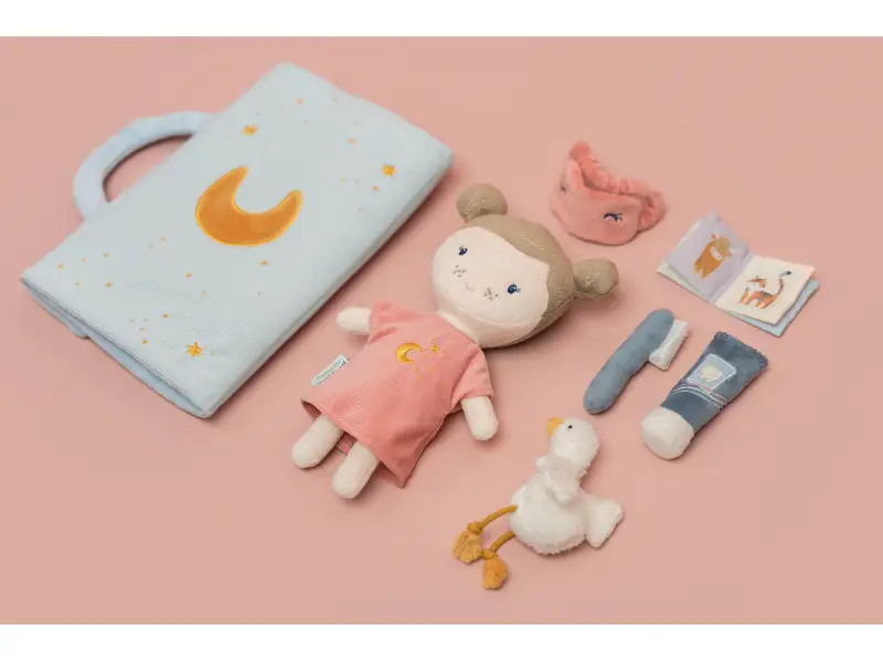 Originálna sada s bábikou v krásnom prevedení z jemného plyšového materiálu. Rosa je nachystaná na prespanie u kamarátky a má so sebou všetko potrebné: perinku, plyšáčika v podobe rozkošnej húsky, kefku s pastou, knižku na čítanie pred spaním a masku na oči. Rovnako ako si vaše deti užívajú spanie u babičky alebo u kamarátov, bude si aj Rosa užívať svoj pobyt na návšteve u vás doma.