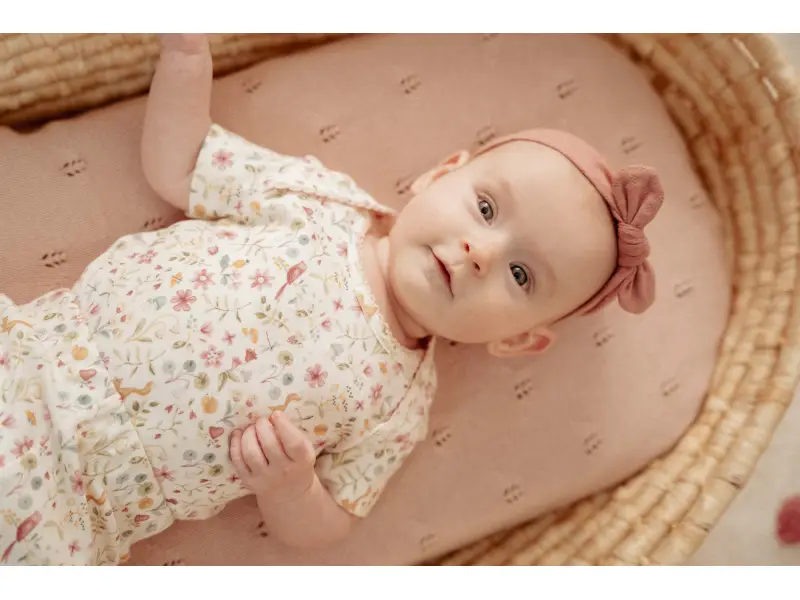 Body z jemnej organickej bavlny s krásnou kvetinovou potlačou má zapínanie na patentky v rozkroku pre ľahké obliekanie dieťaťa.