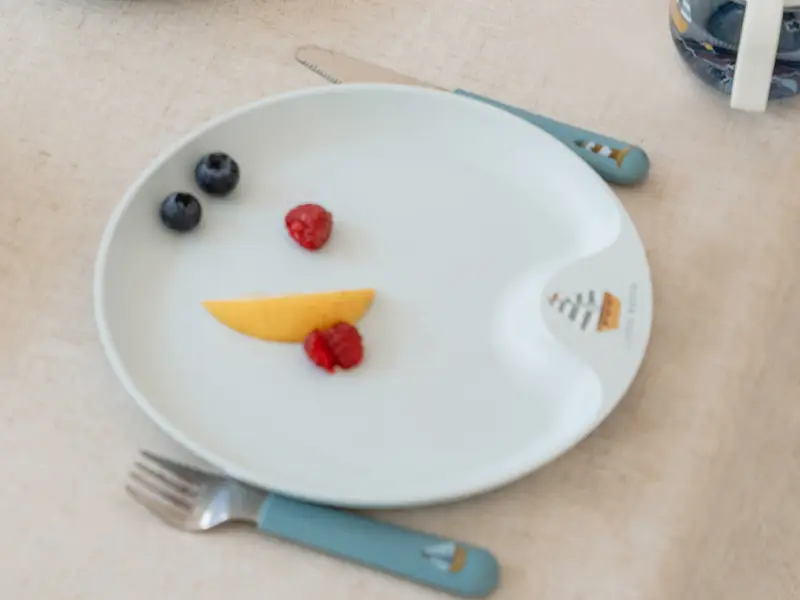 3-dielna sada príboru z kvalitnej nerezovej ocele s plastovou rukoväťou pre ľahké držanie s krásnou potlačou. Nôž má bezpečný zúbkovaný okraj.
