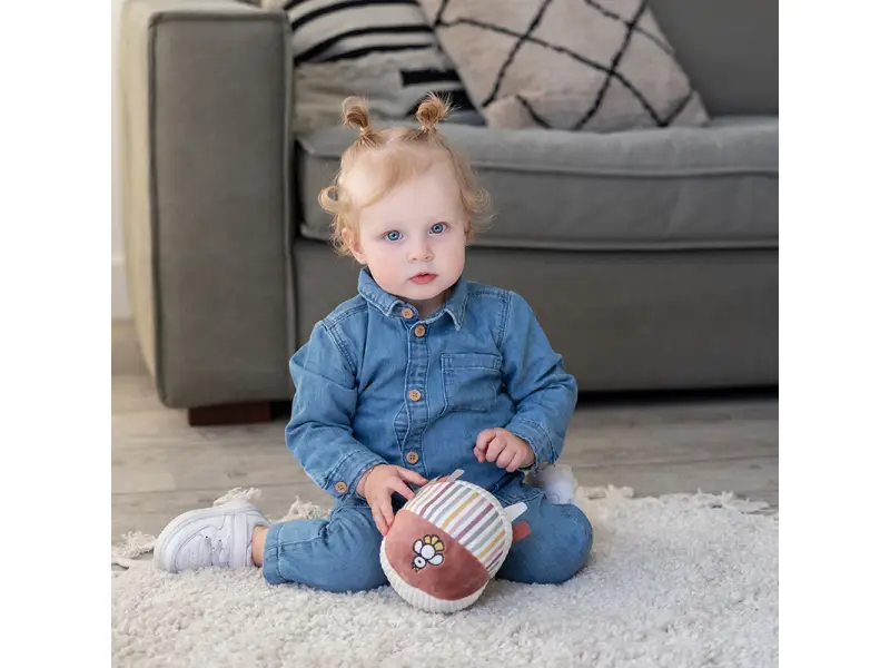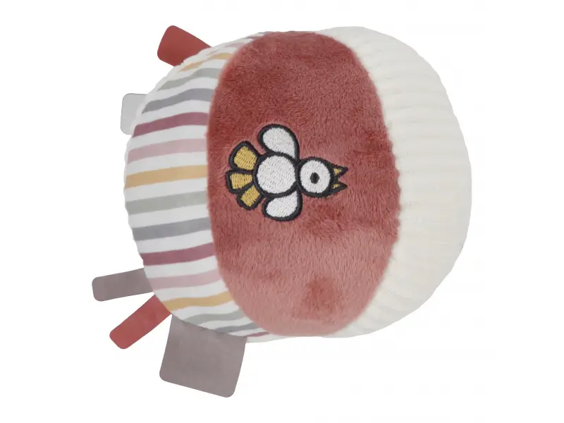 Mäkká textilná loptička je vďaka svojmu prevedeniu ľahko uchopiteľná malými detskými ručičkami. Rôznorodé textúry a vzory lákajú dieťa na skúmanie, loptička navyše pri pohybe jemne cinká.