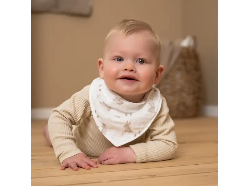 Podbradník v tvare šatky v krásnom dizajne kolekcie Little Dutch Baby Bunny je vyrobený z mäkkej, jemnej 100% organickej bavlny pre pohodlie vášho dieťaťa. Podbradník s podšívkou je ideálny na zachytenie slín napr. pri raste prvých zúbkov. Využijete ho aj ako šatku na ochranu krku dieťaťa v chladnom počasí.
