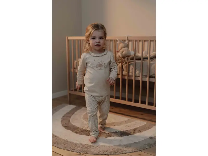 Detské pyžamo s dlhým rukávom je vyrobené z mäkkej organickej bavlny zdobenej krásnou potlačou a volánikom okolo výstrihu.
