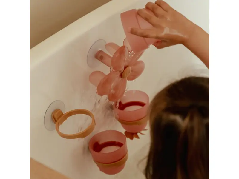 Premeňte kúpanie na radostnú hru so sadou téglikov Little Dutch! Tento hravý set obsahuje vodný mlynček v tvare kvetiny, dva tégliky a nalievací hrnček, ktoré je možné pomocou prísaviek ľahko pripevniť na stenu vane alebo sprchy. Stačí naliať vodu na kvetinu a sledovať, ako sa začne točiť – deti si pritom precvičujú koordináciu, objavujú zákonitosti pohybu vody a rozvíjajú jemnú motoriku. Jemné farby a premyslený dizajn hračky robia z kúpania príjemný rituál plný fantázie a objavovania.