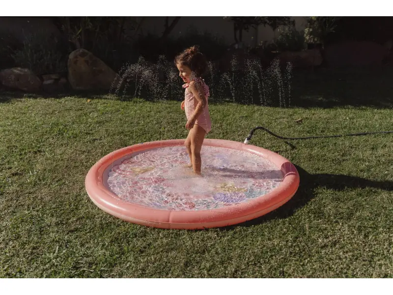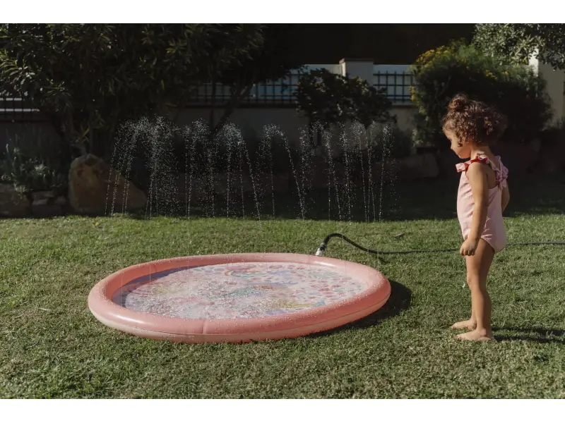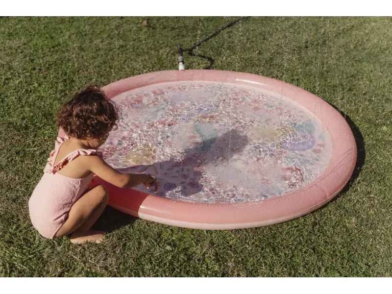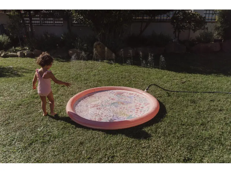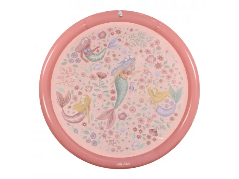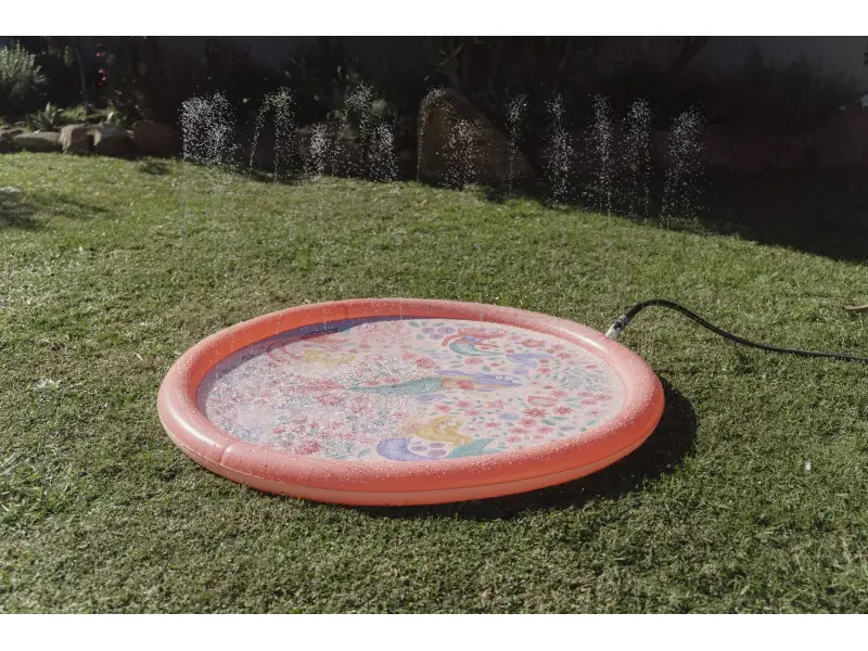 Originálna hracia podložka s vodotryskom, ktorý vytvoríte jednoducho pripojením na záhradnú hadicu s pomocou priloženej spojky. Podložka s krásnou potlačou motívov zo života morskej víly a kvetov je ideálny doplnok na záhradu počas horúcich letných dní. Deti si budú užívať behanie cez striekajúci vodotrysk aj hranie sa s vodou na podložke, ktorá funguje ako plytký bazénik.