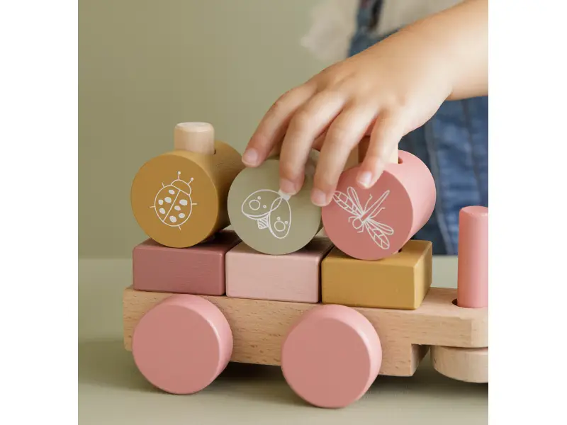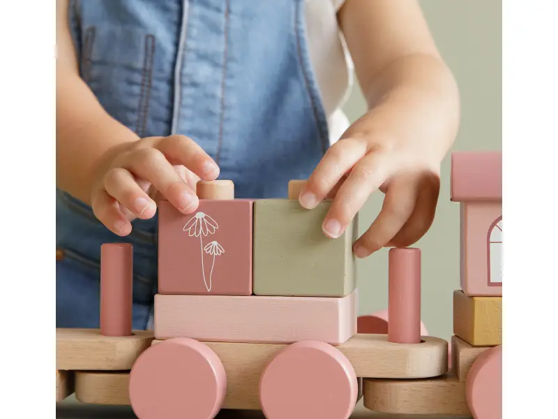 Krásny drevený vláčik z dielne Little Dutch je potlačený obrázkami kvetín, včielok a chrobáčikov z kolekcie Flowers. S kockami rôznych tvarov a farieb môže vaše dieťa zostavovať rôzne varianty vagónov.