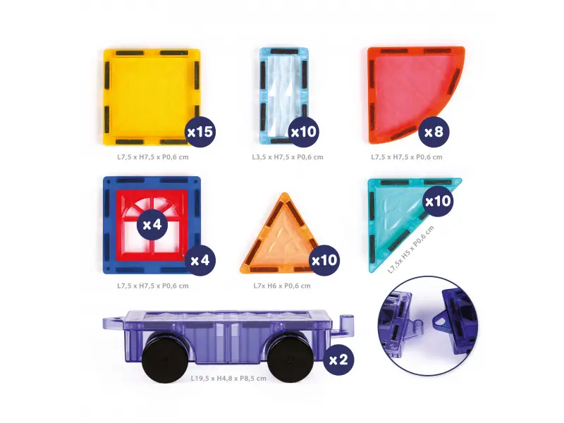 Objavte svet plný pohybu a fantázie s magnetickou stavebnicou Ludi! Praktický plastový box s držadlom ukrýva 63 magnetických dielikov, medzi ktorými sú aj 2 podvozky s kolieskami, vďaka ktorým môžu deti stavať vlastné autá, nákladiaky alebo napríklad pohyblivé stavebné stroje.Deti môžu kombinovať rôzne časti a vytvárať nekonečné množstvo vozidiel a stavebných štruktúr.
