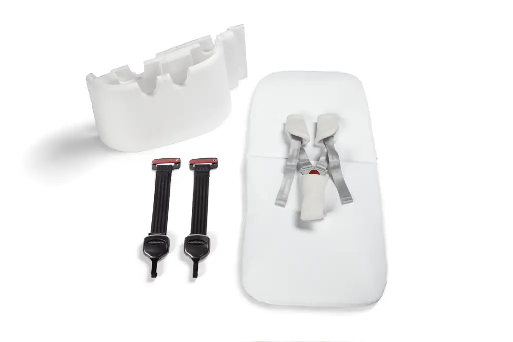 pripevňovacie pásy, 3-bodový bezpečnostný pás s ramennými vypchávkami, matrac do vozidla a ochranné polystyrény.