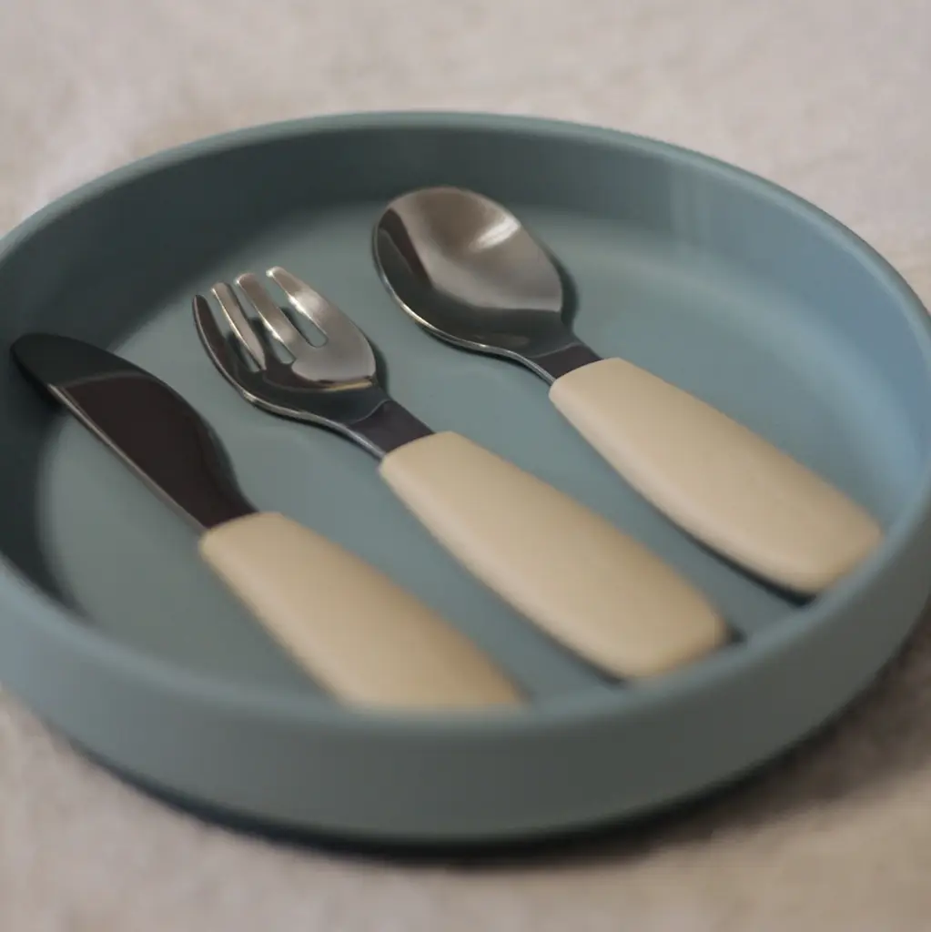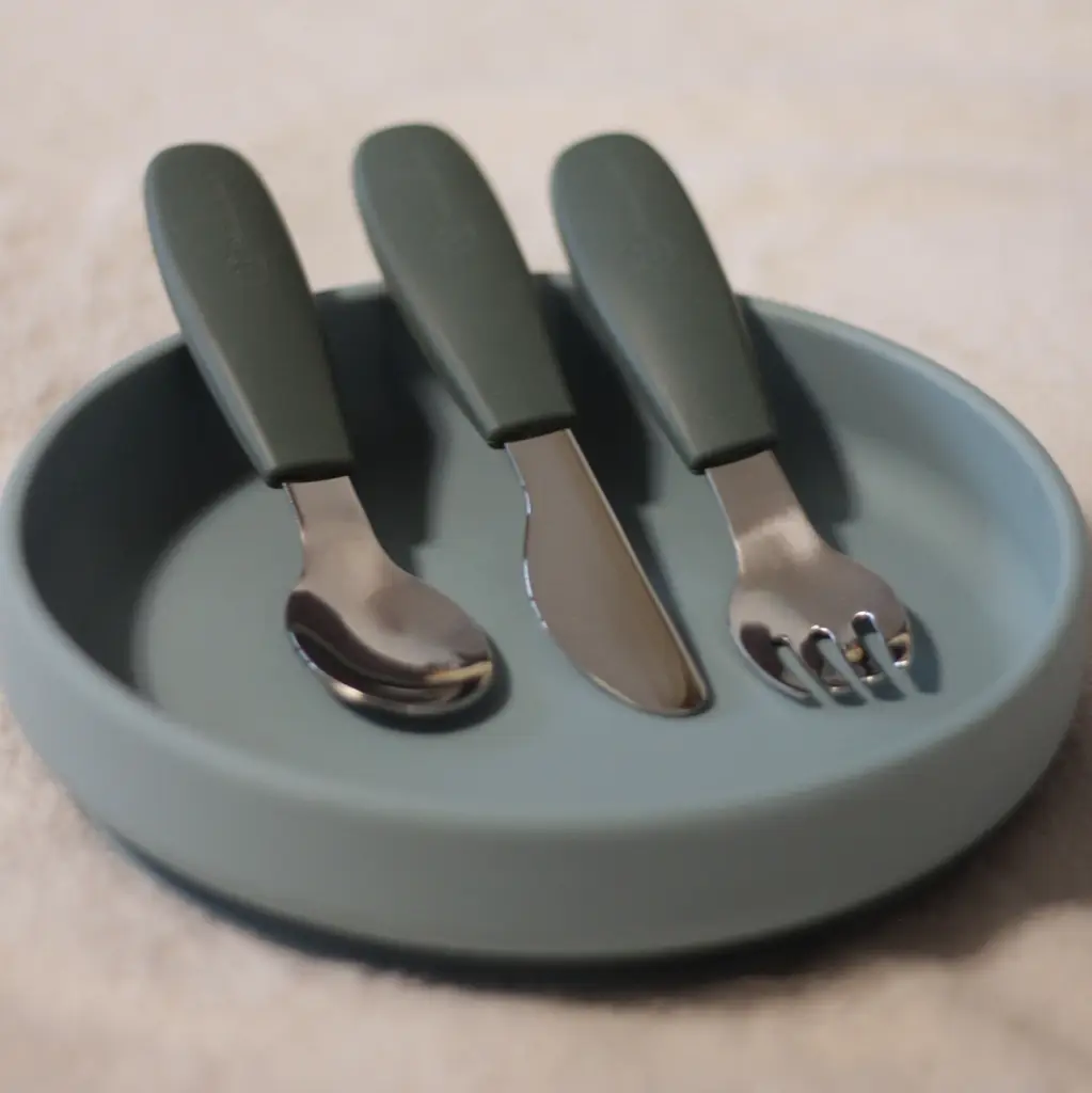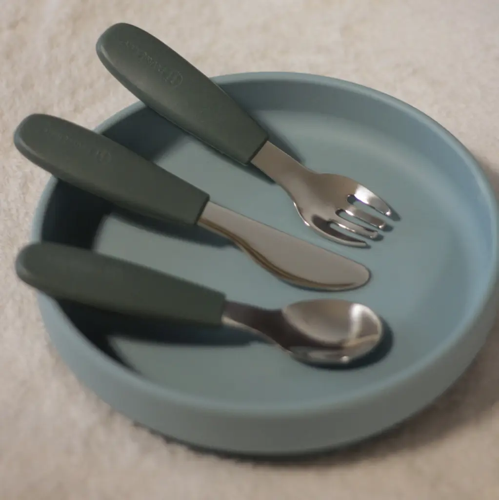 Funkčné časti sú vyrobené z kvalitnej nehrdzavejúcej ocele, rukoväte sú ergonomické a potiahnuté mäkkým silikónom vhodným na kontakt s potravinami – ideálne prispôsobené detským rúčkam. To zaručuje pohodlný a istý úchop a podporuje správne stravovacie návyky.