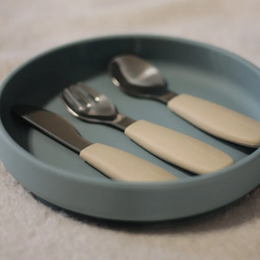 Funkčné časti sú vyrobené z kvalitnej nehrdzavejúcej ocele, rukoväte sú ergonomické a potiahnuté mäkkým silikónom vhodným na kontakt s potravinami – ideálne prispôsobené detským rúčkam. To zaručuje pohodlný a istý úchop a podporuje správne stravovacie návyky.