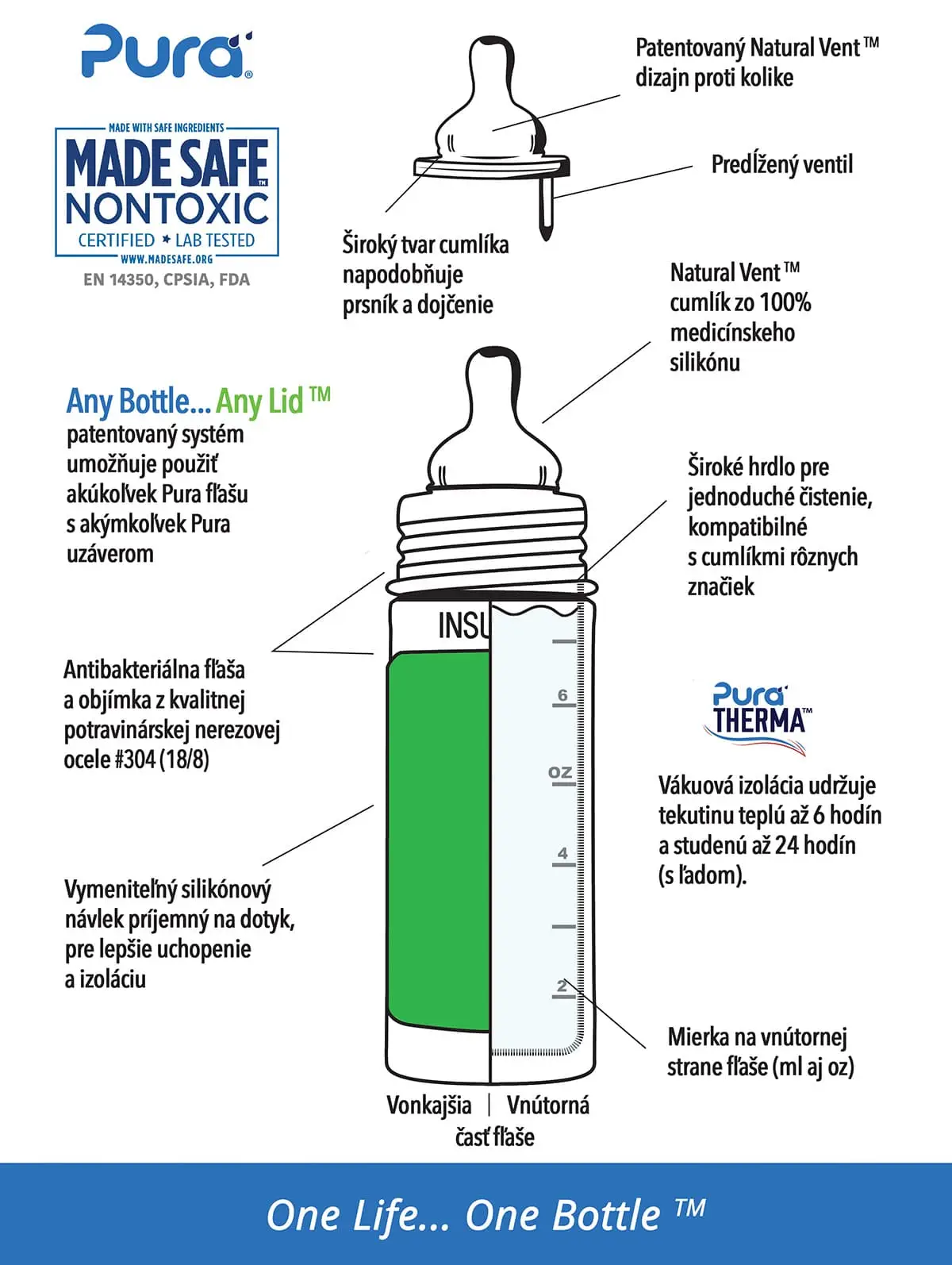 Konečne bezpečná fľaša vyrobená 100% bez plastových častí. S Pura fľašami si môžete byť istí, že sa do nápoja vnútri neuvoľňujú žiadne škodlivé látky a toxíny, ani príchute a pachy ako je tomu u plastových fliaš alebo fliaš s plastovými vrchnákmi. Na ničom nezáleží viac ako na zdraví Vašich detí a Vás.Kvalitná vákuová termoizolácia udrží tekutinu teplú až 6 hodín a studenú až 24 hodín (s ľadom).Pura fľaše sa navyše prispôsobujú a “rastú” s Vašim dieťaťom. Jednoduchou výmenou uzáverov sa fľaša mení z dojčenskej fľaše na fľašu s náustkom, slamkou alebo športovým uzáverom či na pohárik na príkrmy a občerstvenie. Môžete tak jednu fľašu používať mnoho rokov. One Life… One Bottle™.Najbezpečnejšia, najuniverzálnejšia, ľahká a nerozbitná ekologická fľaša ocenená viac ako 35 oceneniami. Prvá fľaša na trhu 100% bez plastových častí a jediná fľaša, ktorá získala certifikát Made Safe® . Vákuová termoizolácia udrží tekutinu teplú až 6 hodín a studenú až 24 hodín (s ľadom). Baby Grows… Bottle Evolves™ - patentovaný systém umožňuje použiť akúkoľvek Pura fľašu s akýmkoľvek Pura uzáverom. Jednoducho tak zmeníte dojčenskú fľašu na fľašu s náustkom, slamkou, alebo športovým uzáverom alebo s použitím tesniaceho disku na pohárik na príkrmy a drobné občerstvenie. Jednu fľašu tak môžete používať roky a zároveň šetríte peniaze aj životné prostredie. Fľaša a objímka sú vyrobené z prvotriednej potravinárskej nerezovej ocele triedy 304 (18/8) a ostatné časti zo silikónu najvyššej medicínskej kvality. Bez BPA, PVC, ftalátov a bez akýchkoľvek iných nebezpečných látok a toxínov, testované podľa smerníc EÚ. Antikolikový cumlík Pura Natural Vent Nipple so stredným prietokom vyrobený zo silikónu medicínskej kvality. Fľaša je kompatibilná s cumlíkmi mnohých iných značiek. Mierka na vnútornej strane pre pohodlné a presné dávkovanie. Súčasťou je silikónový vrchnák chrániaci cumlík a vymeniteľný farebný silikónový návlek na fľašu pre lepšie uchopenie a izoláciu. Nevhodné do umývačky riadu. Pre zachovanie termo-izolačných vlastností odporúčame fľašu umývať ručne. Nesterilizovať. Doživotná zaruka na časti z nerezovej ocele. Nevzťahuje sa na mechanické poškodenie fľaše. Váha: 182gRozmery: 5,9 x 19,6cmBalenie obsahuje: nerezovú fľašu s vákuovou termoizoláciou 260ml, nerezovú objímku, antikolikový cumlík Pura Natural Vent Nipple (stredný prietok), silikónový návlek a vrchnák