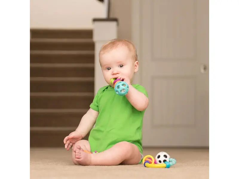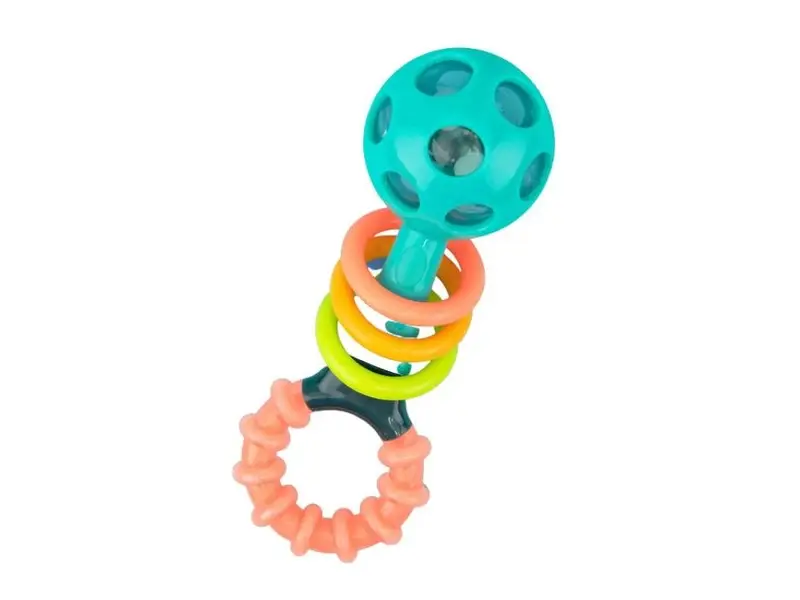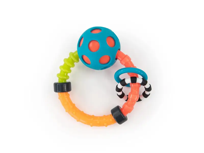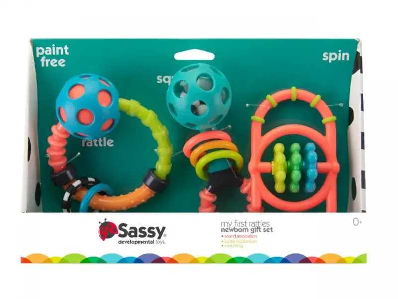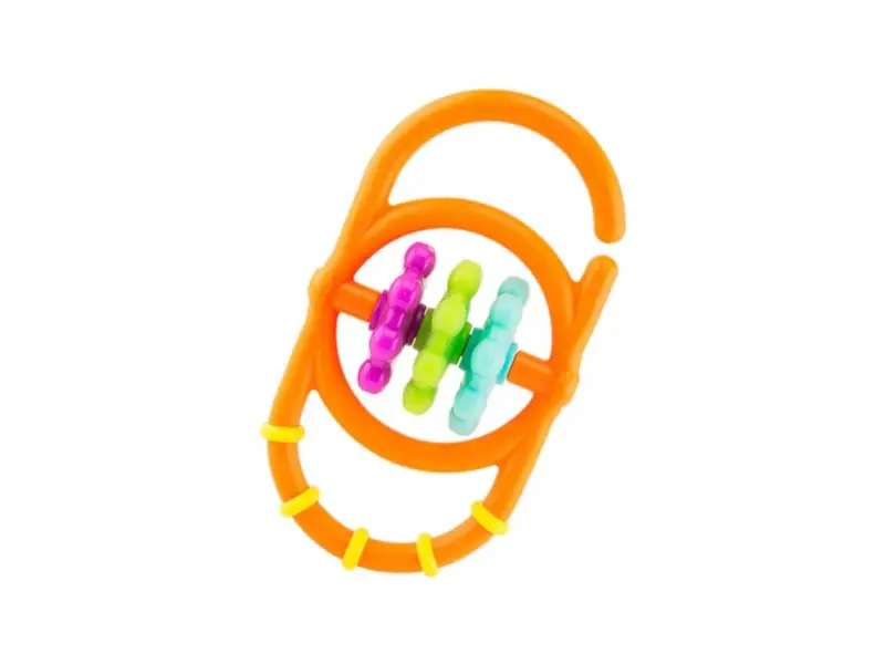 Sada hrkálok v kontrastných farbách z príjemného materiálu as tvarom pre ľahké uchopenie. Korálky vo vnútri loptičiek a krúžky na rukovätiach pri pohybe hrkajú a lákajú dieťa na skúmanie rukami aj ústami.