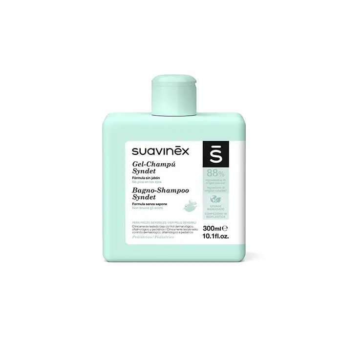 Suavinex Syndet čistiaci gélový šampón neobsahuje mydlo a je špeciálne navrhnutý tak, aby čistil pokožku a vlasy. Jeho olivové mastné kyseliny pomáhajú predchádzať vysušenie pokožky a výťažok z nechtíka je známy svojím upokojujúcim účinkom, kedy pomáha starať o citlivú pokožku. Prípravok je obohatený provitamínom B5, dodávajúcim vlasom mäkkosť, hydratáciu a lesk. pH hodnota tohto gélu/šampónu je vhodné pre pokožku novorodencov.