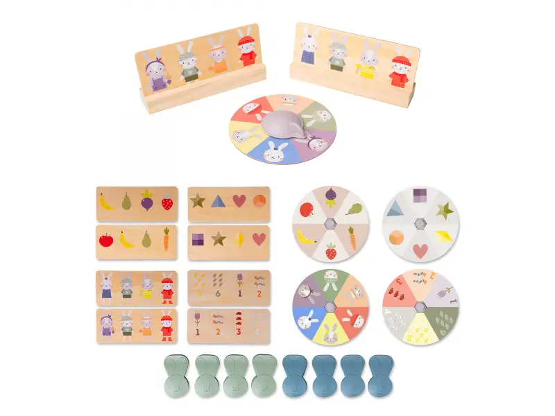 Súprava obsahuje 4 bohato ilustrované obojstranné drevené hracie dosky, 2 stojany, 2 obojstranné kruhové karty, 8 plastových kolíkov v tvare zajačikov, 1 plastovú točiacu sa šípku s podstavcom.