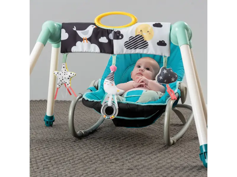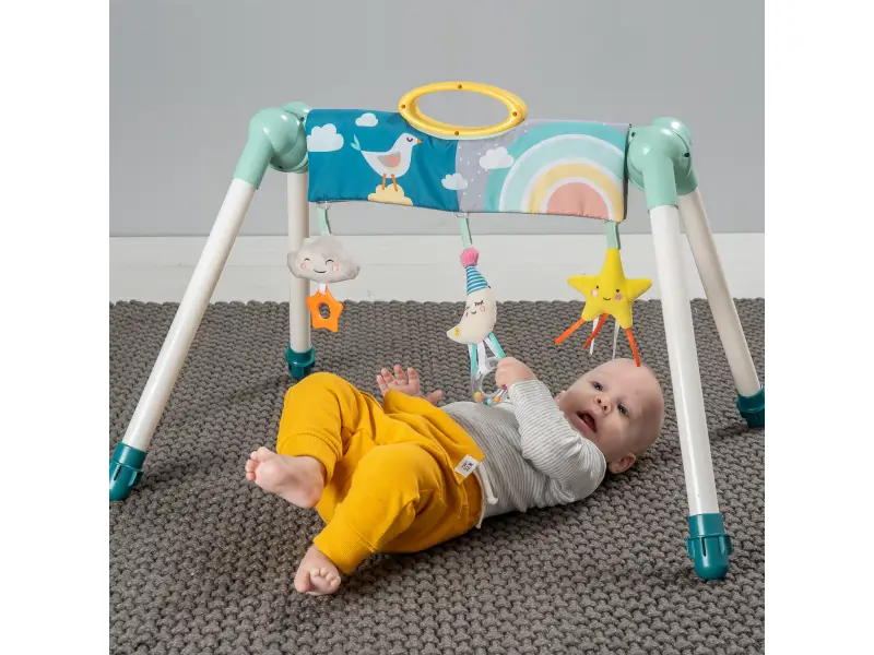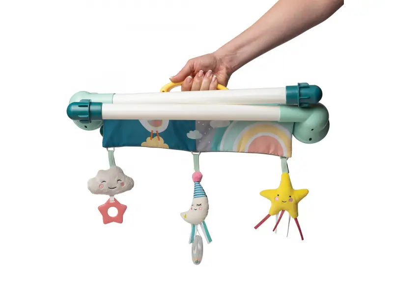 Skladacia hrazda zabaví vaše bábätko doma i na cestách. Na hrazde sú zavesené tri hrkajúce a cinkajúce hračky s hryzátkami. Hračky sa upevňujú na suchý zips a je možné ich umiestniť kdekoľvek na hrazde. Hrazdu využijete pre zabavenie dieťaťa ležiaceho na deke aj v hojdacom lehátku.