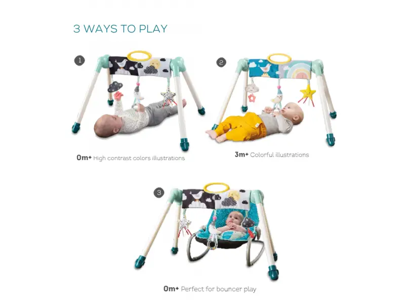 Horný panel hrazdy aj zavesené hračky ponúkajú dve strany pre dve vývojové štádiá dieťaťa: Pre dieťa od narodenia je určená strana s vysoko kontrastnými čierno-bielymi ilustráciami, pre dieťa od 3 mesiacov potom strana s veselými farebnými obrázkami.