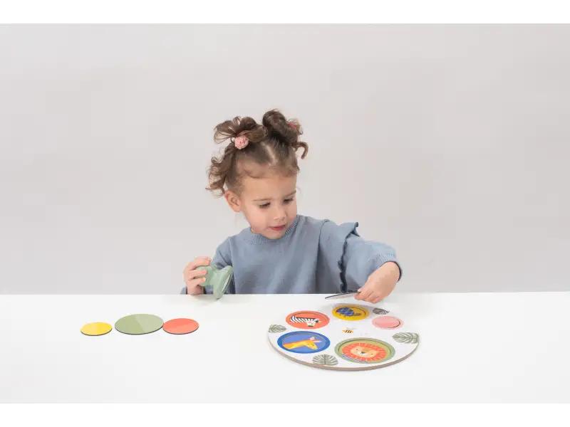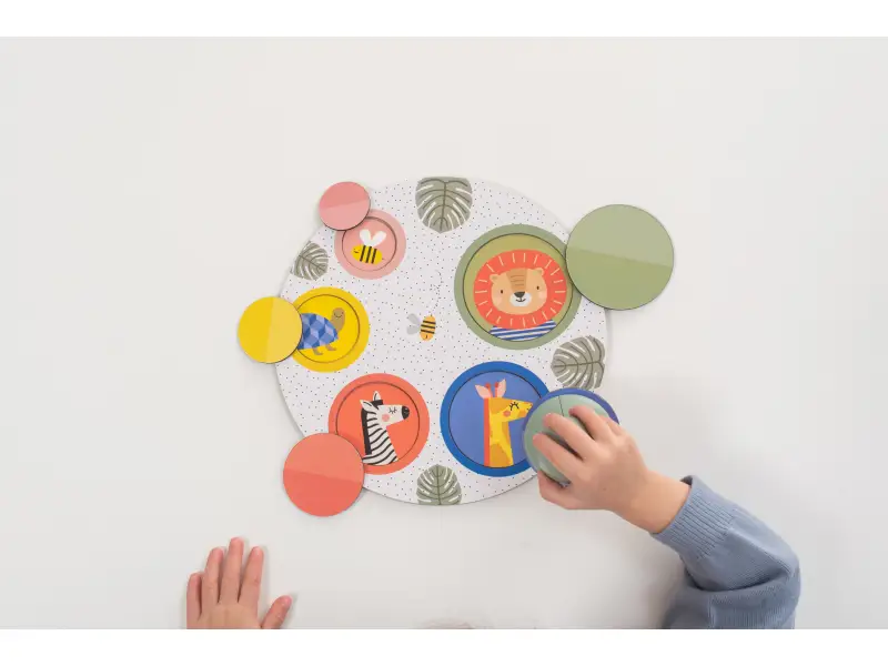 Originálnu magnetickú hru tvorí hracia podložka, ilustrované okrúhle kartičky, magnetické okrúhle kartičky a magnetický chytač. Hra je ideálna pre spoločné hranie dieťaťa s rodičmi, prinesie vám veľa spoločnej zábavy a zároveň vám umožní učiť dieťa zábavnou formou rozpoznávať zvieratká, farby, tvary aj čísla.