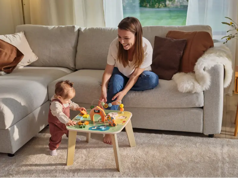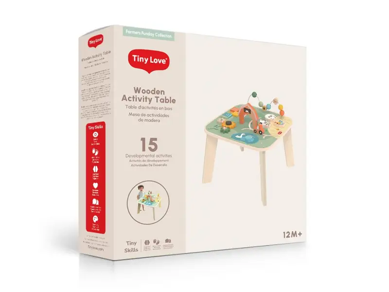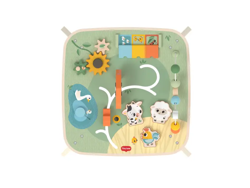 Drevený stolík s aktivitami Tiny Love je skvelá hračka pre malých objaviteľov, ktorá ponúka množstvo možností, ako sa hrať, skúmať a učiť sa. Na jednom mieste kombinuje rôzne pohyblivé prvky, vkladanie a skryté prekvapenia - dieťa si tak prirodzene trénuje jemnú motoriku, koordináciu ruka-oko, sústredenie aj prvé logické uvažovanie. Stolík s krásnymi motívmi zo života na farme podporuje samostatnú hru, ale zároveň je ideálny aj pre spoločné chvíle s rodičmi alebo súrodencami.