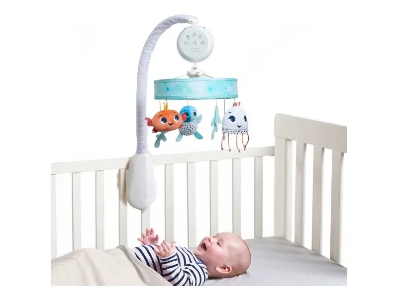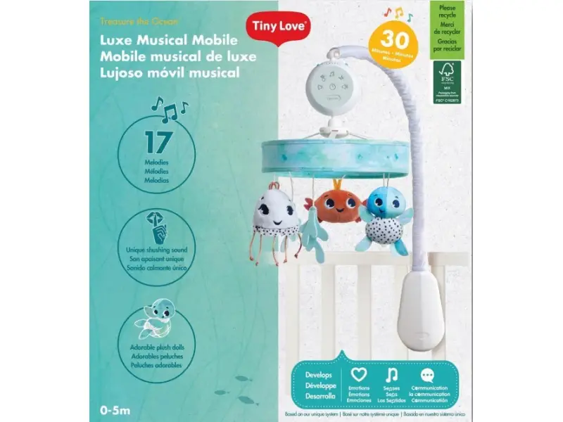 Hudobný kolotoč Tiny Love v luxusnom prevedení s krásnymi zavesenými hračkami a vyšívanou konštrukciou utíši aj zabaví vaše bábätko v postieľke. Hudobný box s nočným svetielkom ponúka 17 rôznych upokojujúcich melódií v celkovej dĺžke 30 minút, 5 typov bieleho šumu a jedinečný utišujúci zvuk. Možnosť nastavenia hlasitosti hudby aj časovača na 10/20/30 minút. Zavesené otáčajúce sa hračky v podobe rozkošných morských živočíchov budú lákať dieťa na pozorovanie a spoločne s hudbou či upokojujúcimi zvukmi bábätko upokojí pred zaspaním.