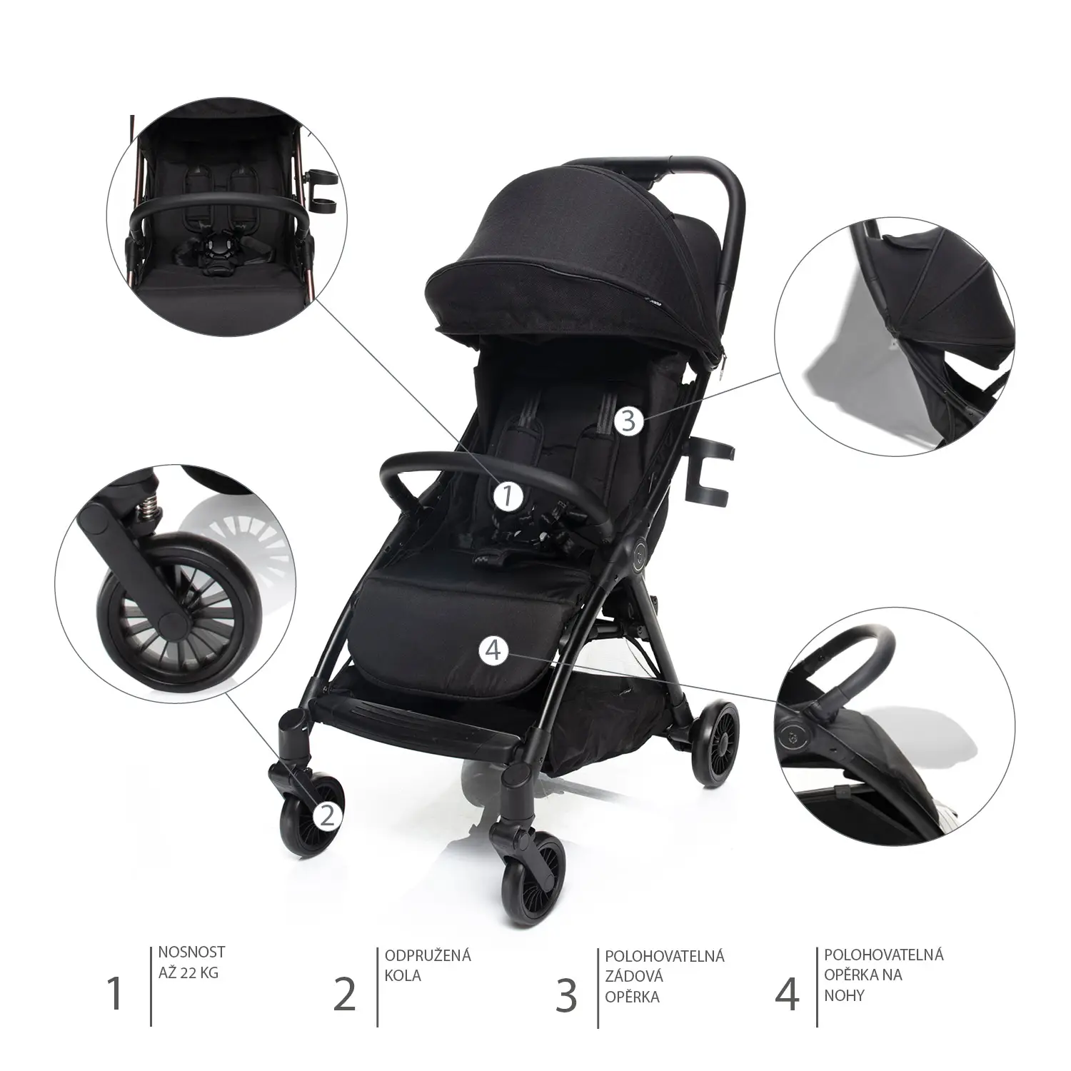 22 kg. Odpružené kolesá zvládnu prechádzky v prírode aj po dlažbe v mestách.