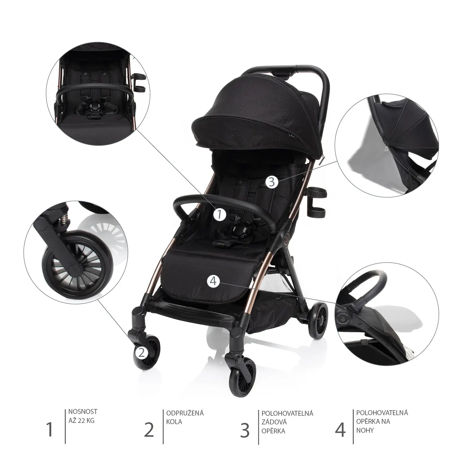 Mäkké športové sedadlo je vybavené 5-bodovým bezpečnostným pásom s magnetickou sponou. Hrazda kočíka sa dá sklopiť, aby sa dieťa ľahšie usadilo. Rozšíriteľná strieška s vetracím okienkom chráni dieťa pred slnkom a vetrom. Súčasťou balenia je aj košík, ktorý unesie až 3 kg predmetov potrebných na cestách.