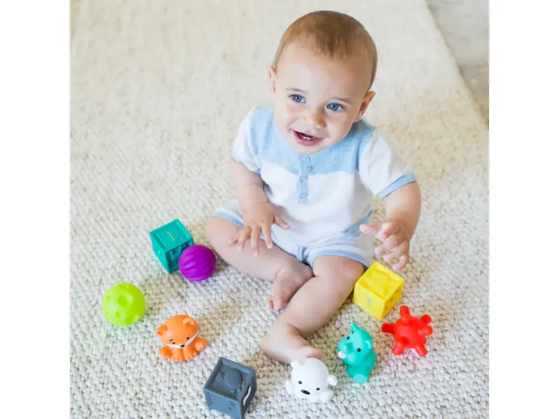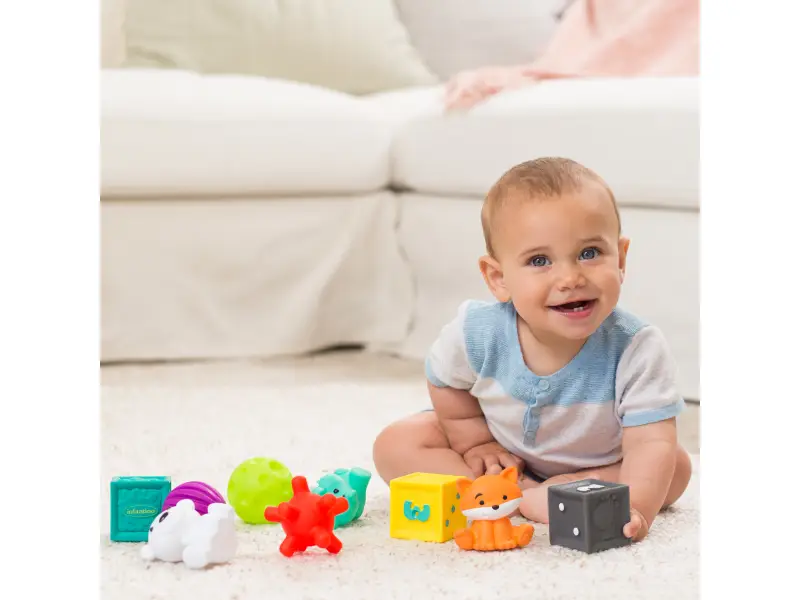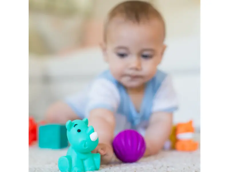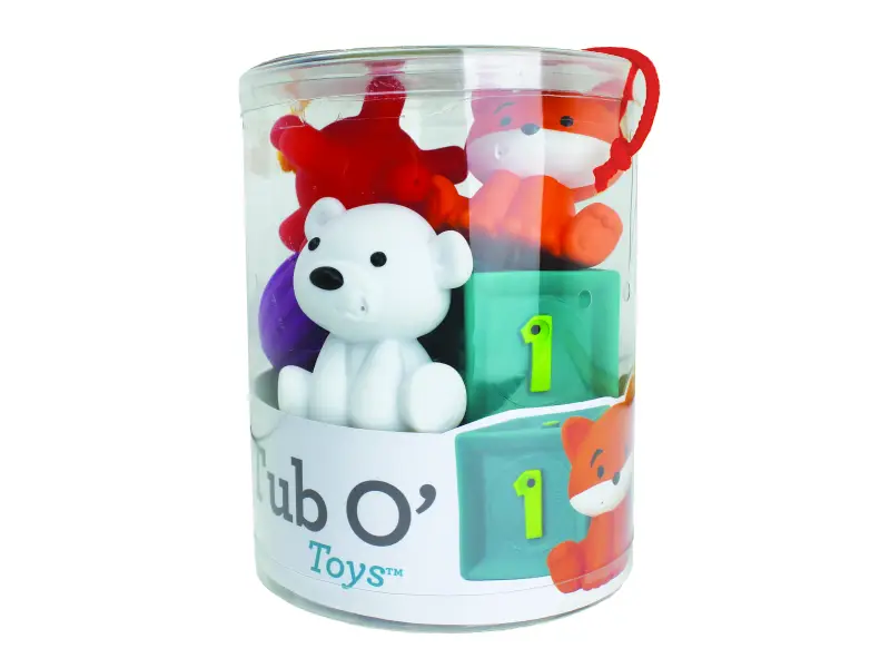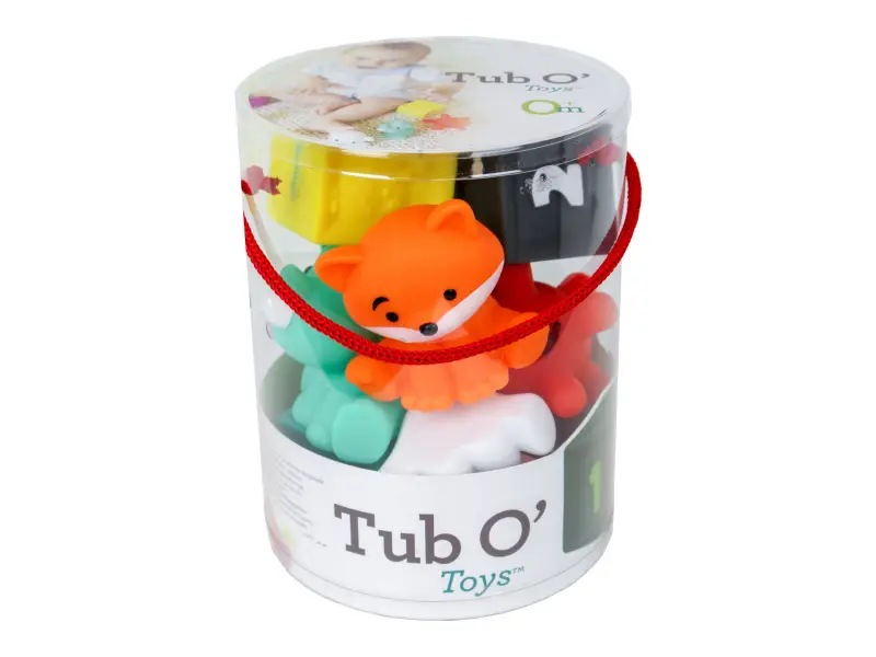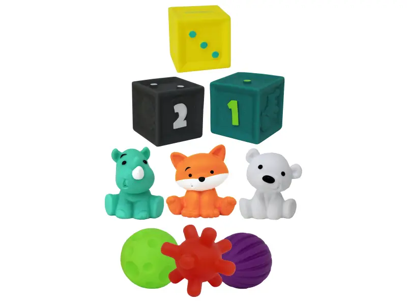 Sada 9 hračiek nielen do kúpeľa obsahuje mäkké očíslované kocky, zvieratká a senzorické loptičky. Rôznorodé textúry lákajú dieťa k skúmaniu rukami aj ústami.
