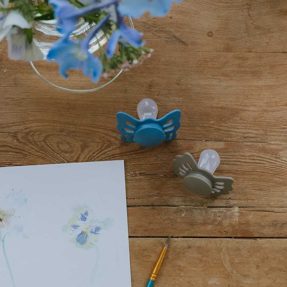 FRIGG Butterfly tvarom pripomína motýľa. Štít so zvlnenými okrajmi má veľké vzduchové otvory a v pristriedku nájdete okrúhly stred, ktorý zvýrazňuje eleganciu cumlíka. Cumlík je inšpirovaný krásnym motýľom. Nielen svojím vzhľadom, ale aj myšlienkou magickej premeny. Aby sa húsenica stala motýľom, prechádza procesom transformácie. Počas tohto procesu húsenica zostáva v kukle a nakoniec rozkvitne ako krásny motýľ. Táto magická premena je symbolom rozvoja života. Aj dieťatko prechádza rôznymi vývojovými štádiami v matkinom lone a na konci transformačného procesu sa dieťa narodí, aby rozkvitlo vo veľkom svete. FRIGG Butterfly je anatomický cumlík s cumíkom, ktorý kopíruje tvar úst. Cumlík je navrhnutý tak, aby vyvíjal menší tlak na podnebie, ďasná a čeľuste a je to najšetrnejší typ cumlíka. Tým sa znižuje riziko krivých zubov a krivého zhryzu. Ortodontický dizajn je ideálny na podporu správneho vývoja detských zubov, čeľuste a podnebia. Detaily cumlíka FRIGG