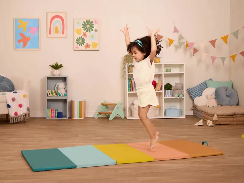 Farebná skladacia podložka WonderTumble je ideálna pre všetky aktívne deti, ktoré sa rady hýbu aj doma. Podložka je tvorená piatimi mäkkými penovými panelmi, ktoré sa ľahko rozložia do priestrannej podložky na skákanie, cvičenie, tancovanie a pod. Jemný mäkký povrch tlmí dopady a podporuje bezpečnejší pohyb pri hraní.
