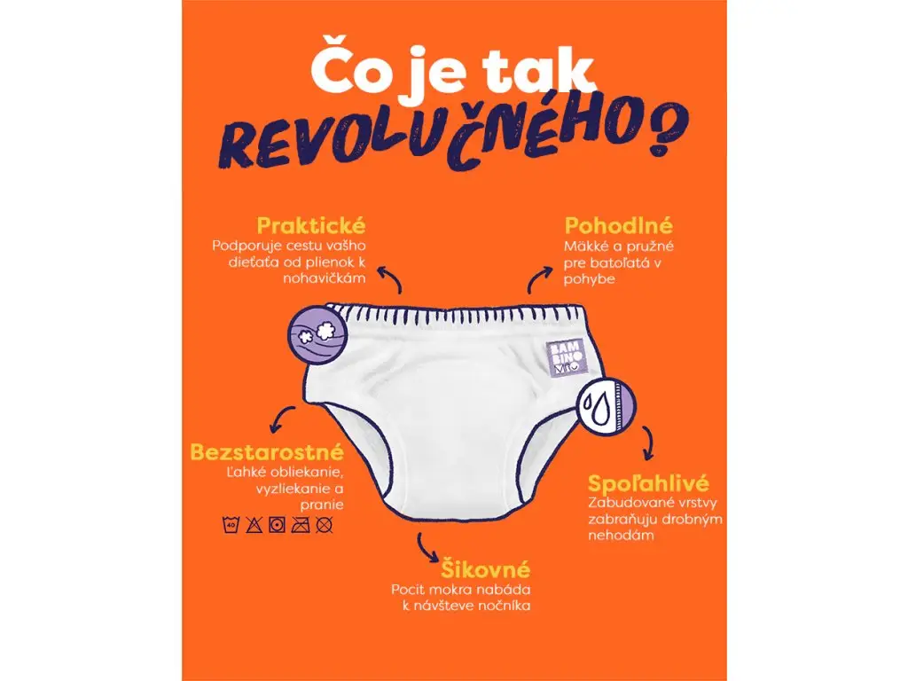 Nepriepustná vrstva spolu s absorpčnou vrstvou čiastočne chráni pred znečistením okolia. Pomáhajú zrýchliť proces učenia sa na nočník, avšak nenahradzujú plienky. Môžete ich dať dieťaťu ako darček. Dodajú dieťaťu pocit, že už vyrástlo a plienky nepotrebuje. Nepoužívajte ich skôr ako je dieťa na prechod na nočník pripravené. Učiace plienkové nohavičky síce obsahujú absopčnú vrstvu, ktorá zachytí menšie množstvo moču, ale nenahradzujú plnohodnotne viacvrstvovú plienku s nohavičkami. Sú určené pre dieťa, ktoré už prechádza na nočník a občas sa mu prihodí nepríjemná príhoda. V učiacich plienkových nohavičkách vlhkosť ihneď ucíti, môže si ju uvedomiť a posadiť sa na nočník. Učiace plienkové nohavičky nedávajte dieťaťu na noc či na spanie a pokiaľ nemáte inú možnosť vložte do nich ešte ďalšiu viacvrstvovú plienku Bambino Mio, ktorá doplní absorpčnú kapacitu. Pred prvým použitím učiace plienkové nohavičky minimálne dvakrát predperte.