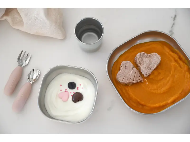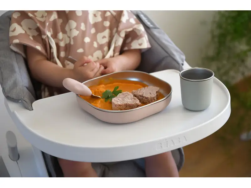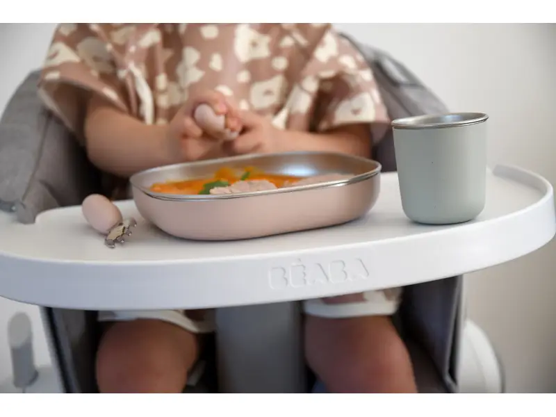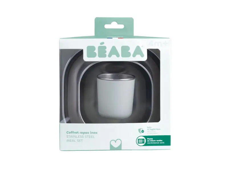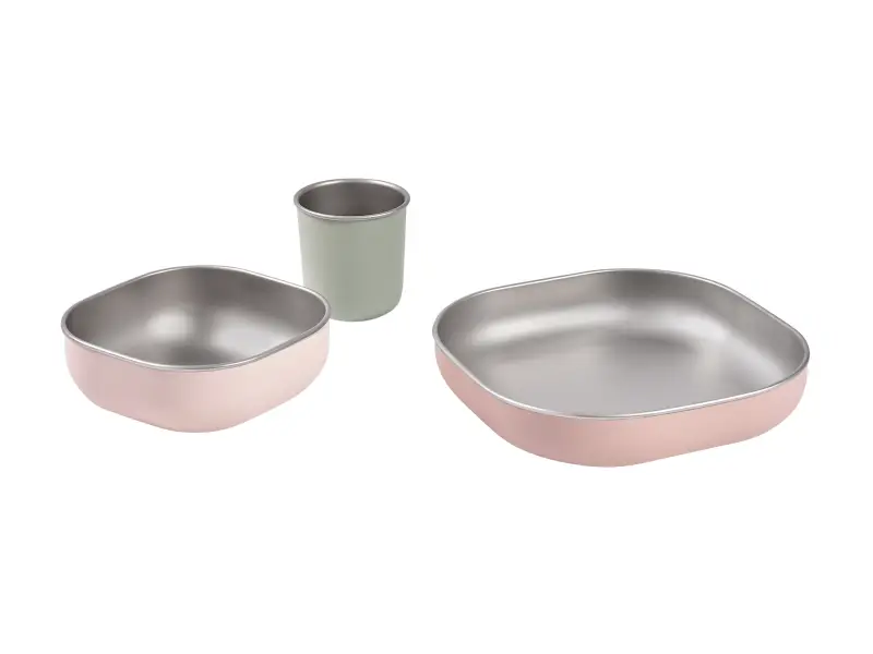 Jedálenskú sadu inovatívneho nerezového riadu so silikónovou povrchovou vrstvou tvorí tanier, miska a kelímok. Ergonomický tvar s vysokými stranami a zaoblenými rohmi sú ideálne na učenie detí samostatnému stolovaniu. Silikónový povrch riadu pomáha, aby riad nekĺzal na stole ani v ruke.