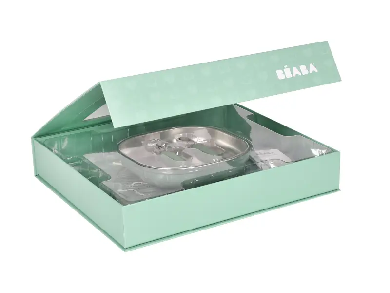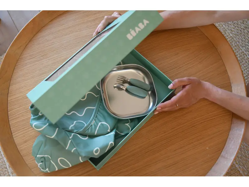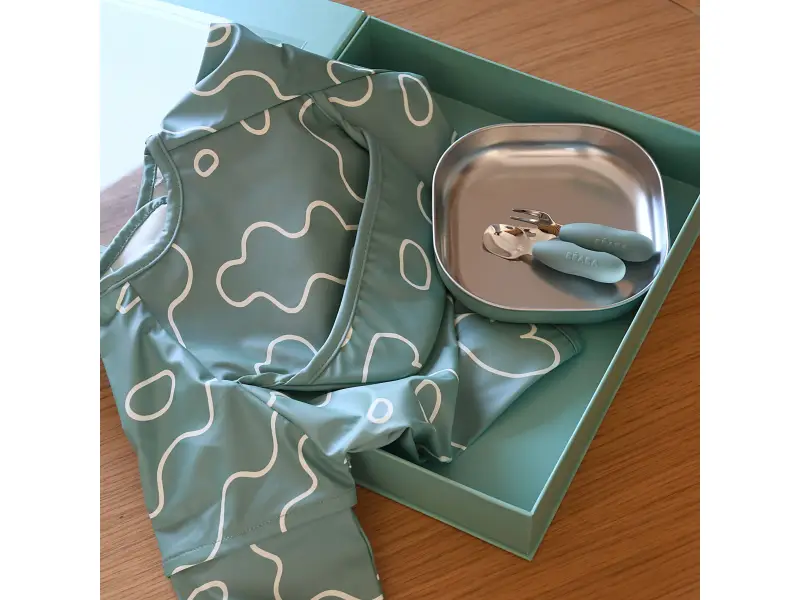Jedálenskú sadu pre najmenších tvorí nerezový tanier so silikónovou povrchovou vrstvou, ergonomická tréningová lyžička a vidlička a podbradník s odopínacími rukávmi a vreckom na omrvinky. Krásnu krabičku, v ktorej je sada zabalená môžete používať aj ako krabičku na drobnosti.