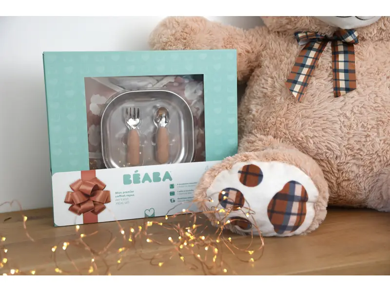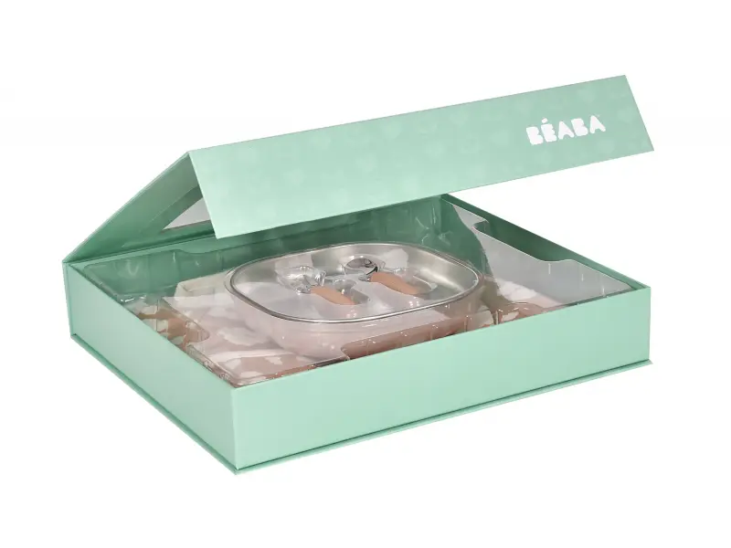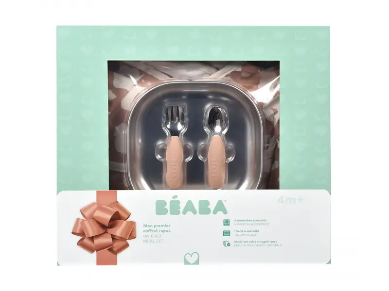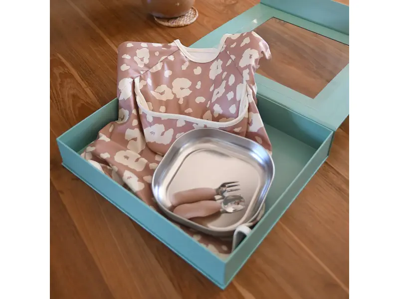 Jedálenskú sadu pre najmenších tvorí nerezový tanier so silikónovou povrchovou vrstvou, ergonomická tréningová lyžička a vidlička a podbradník s odopínacími rukávmi a vreckom na omrvinky. Krásnu krabičku, v ktorej je sada zabalená môžete používať aj ako krabičku na drobnosti.