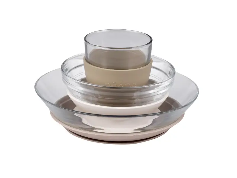 Unikátnu sadu riadu z tvrdeného skla tvorí jedálenská miska, tanierik a pohár ergonomického, zaobleného tvaru s hladkými hranami. Miska a tanier sú doplnené špeciálnymi odnímateľnými podložkami z pružného materiálu s prísavkou, ktorá zaisťuje stabilitu misky či taniera na stole a uľahčuje dieťaťu stolovanie. Návlek na pohárik z rovnakého materiálu uľahčuje dieťaťu uchopenie pohára a znižuje riziko jeho vykĺznutia z ruky.