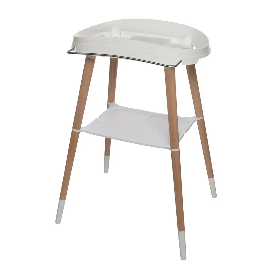 Veľmi stabilný stojan Sense má nohy vyrobené z bukového dreva s certifikáciou FSC. To dodáva stojanu teplý, moderný vzhľad. Je vybavený praktickými pomôckami: vpredu je pripevnený držiak na uteráky. Priestorná plastová polička poskytuje dostatok miesta napríklad pre šampón, žinku, vodné hračky či kúpací gel. To znamená, že máte po ruke všetky potrebné veci, aby ste si s dieťatkom mohli pokojne užiť kupkanie. Inovativný systém upevnenia zaisťuje, že vaňa sa dá jednoducho pripevniť k stojanu a rovnako jednoducho dať dole. Po kliknutí môžete svoje dieťatko nerušene a bezpečne kúpať.