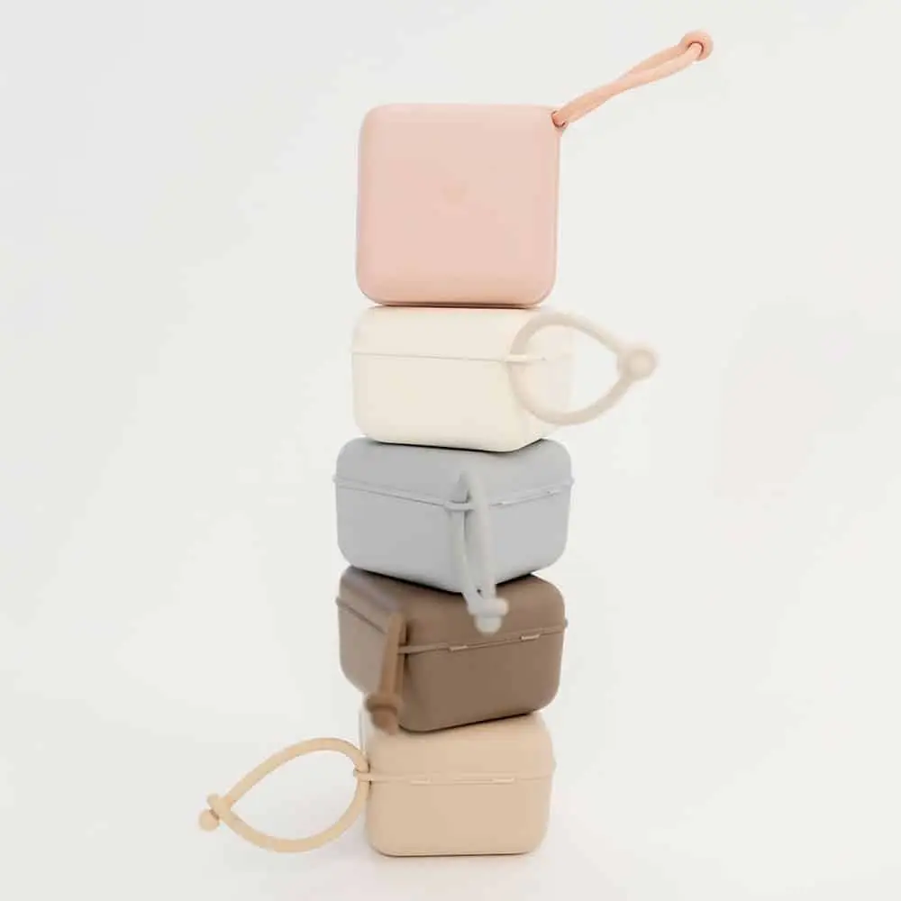 Krabička, box, púzdro, obal, … jednoducho pomocník, ktorý ochráni cumlík pred znečistením, keď ho práve nepotrebujete. No nie len to… BIBS krabička na cumlíky je zároveň aj sterilizačným boxom na sterilizáciu cumlíkov v mikrovlnke alebo šikovnou krabičkou na akékoľvek drobnosti, ktoré chcete mať po ruke kdekoľvek ste. Keďže je vyrobená z bezpečného potravinárskeho materiálu, je vhodná aj ako dóza na drobný snack. Vďaka šikovnému silikónovému pútku si BIBS krabičku na cumlíky pripevníte na tašku, kočík, ku postieľke, či autosedačke.