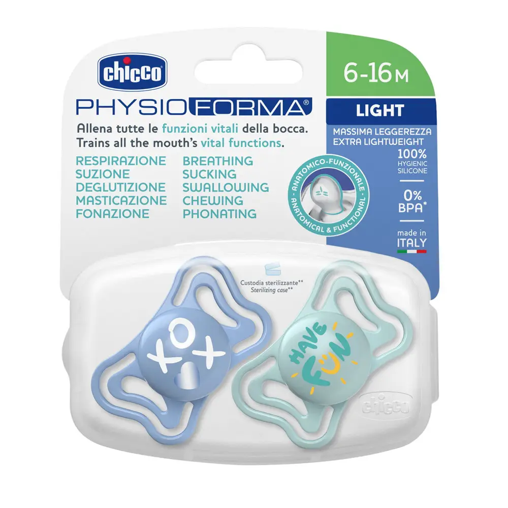 Cumlík Chicco Physio Light rady Physioforma predstavuje aktívny ortodontický upokojujúci cumlík s odľahčenou, extra odvetrávanou základňou, aby dieťatko ani nevedelo, že má niečo na tváričke. Tvarovaný štít s vetracími otvormi pre cirkuláciu vzduchu vyhovuje malým kontúram tváre dieťaťa a pomáha znižovať hromadenie vlhkosti okolo ústočiek. Extra mäkký cumlík pre vyšší komfort a menšie kĺzanie navyše pomáha dieťaťu zostať prisaté. Ergonomický tvar cumlíka dokázateľne podporuje správne fyziologické dýchanie novorodencov. Napomáha polohe jazyka smerom na podnebie, teda smerom dopredu a hore, a tak učí dieťatko dýchať správne nosom už od narodenia. Okrem toho tento anatomický cumlík podporuje správny vývoj čeľuste. Nesprávne dýchanie ústami, od ktorého ergonomický tvar cumlíkov Chicco Physioforma deti odnaučí, totiž zvyšuje riziko SIDS, a tiež prispieva k nesprávnemu vývoju úst a sánky. Cumlíky sú balené v sterilizačnom puzdre, ktoré môžete mať stále pri sebe a pomocou puzdra v mikrovlnke za 3 minúty cumlíky vysterilizovať. Physio Light cumlík je výborným pokračovacím cumlíkom po cumlíku Chicco Micró, ale aj akomkoľvek inom cumlíku 0-2m.