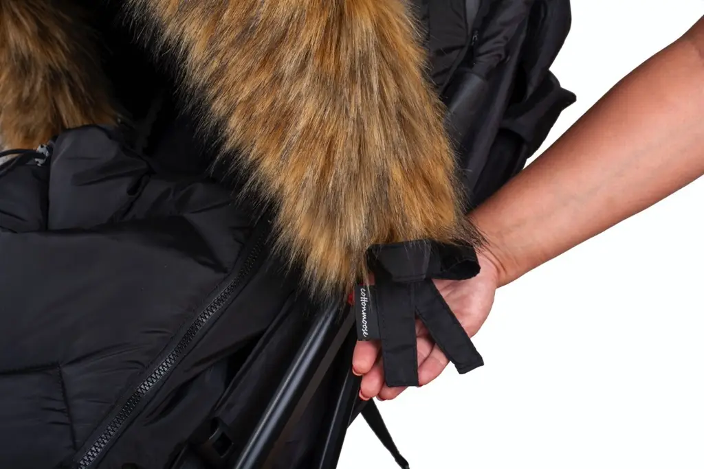 Teplý a univerzálny rukávnik vhodný pre ženy a mužov, chrániaci pred chladom, snehom, dažďom a vetrom, inštalovaný na kočíku so zipsami a stuhami všitými do rukávnika.