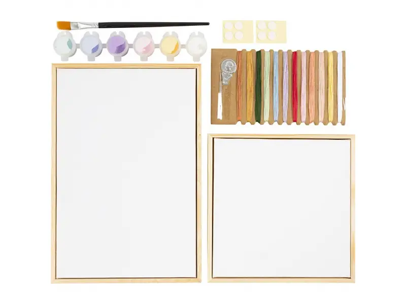 Plátna, rámčeky, farby, štetec, vyšívacie nite, ihla a navliekač nití